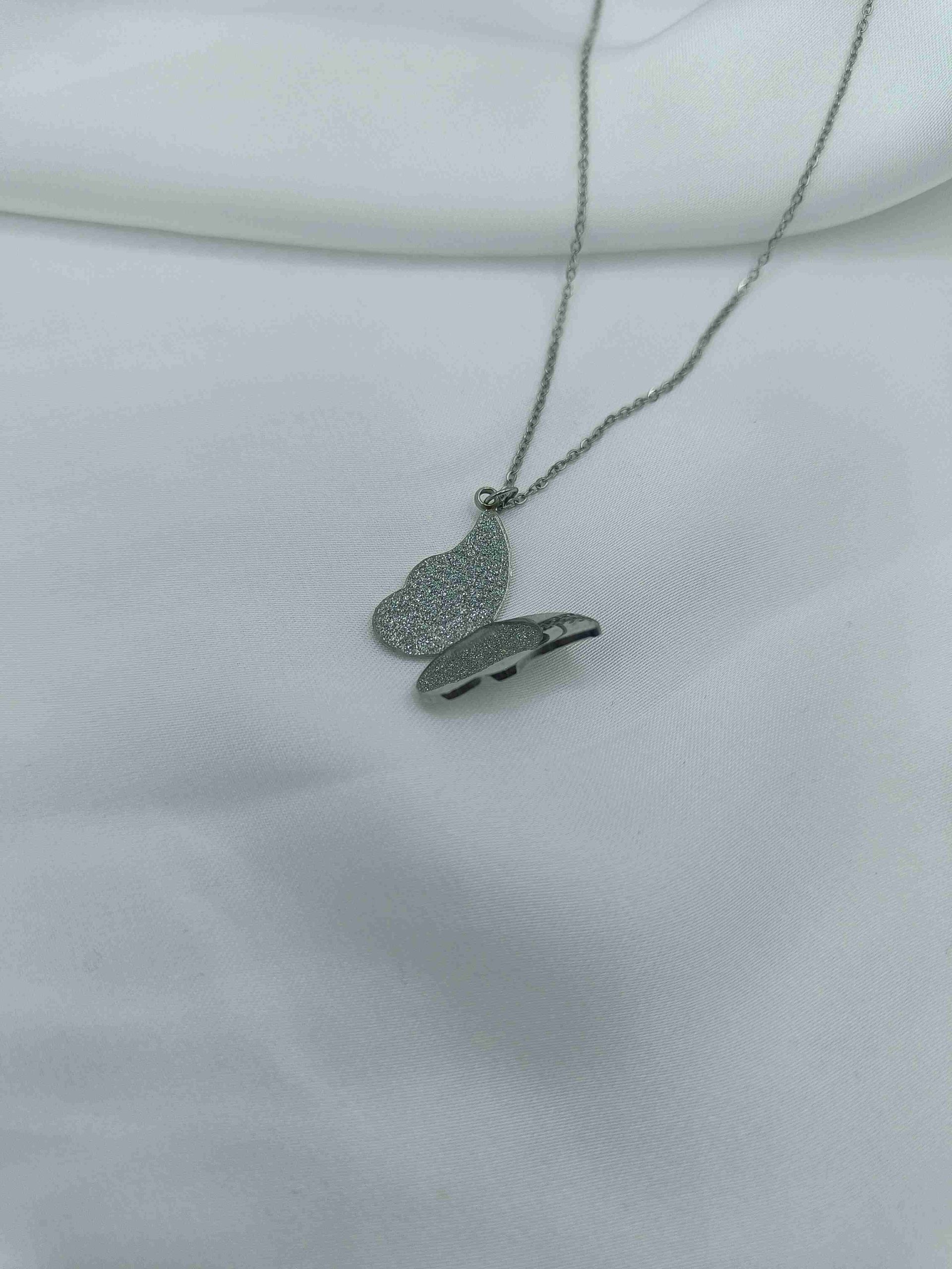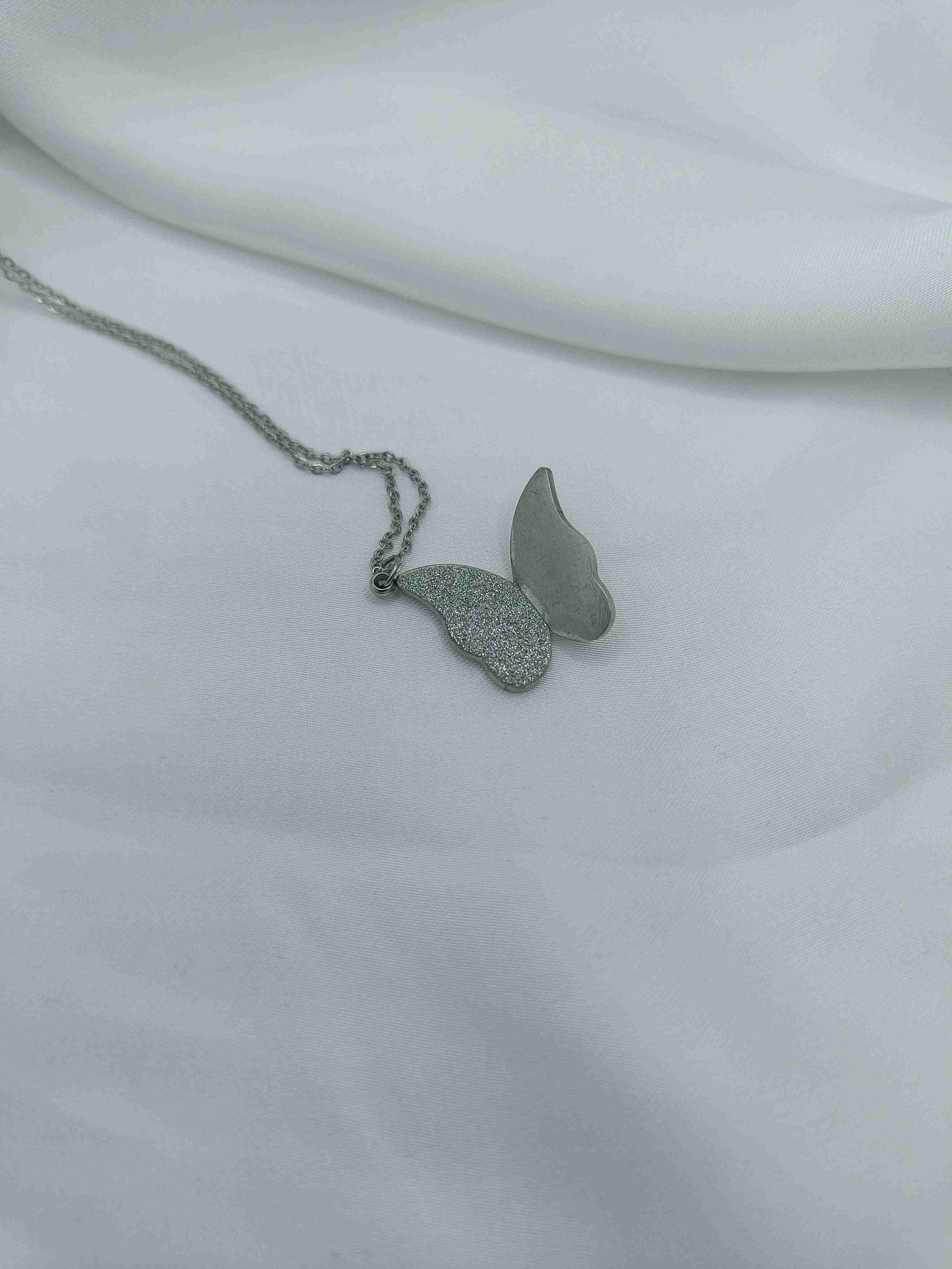 Ένα εκλεπτυσμένο κολιέ με πεταλούδα ως κεντρικό στοιχείο, που αιχμαλωτίζει τη μαγεία της αντίθεσης. Το ένα της φτερό είναι λείο και ήσυχο, ενώ το άλλο ανάγλυφο, σφυρήλατο και γεμάτο λάμψη. Σαν δύο πλευρές της ίδιας ψυχής, ισορροπούν σε τέλεια αρμονία πάνω σε μία κομψή αλυσίδα.