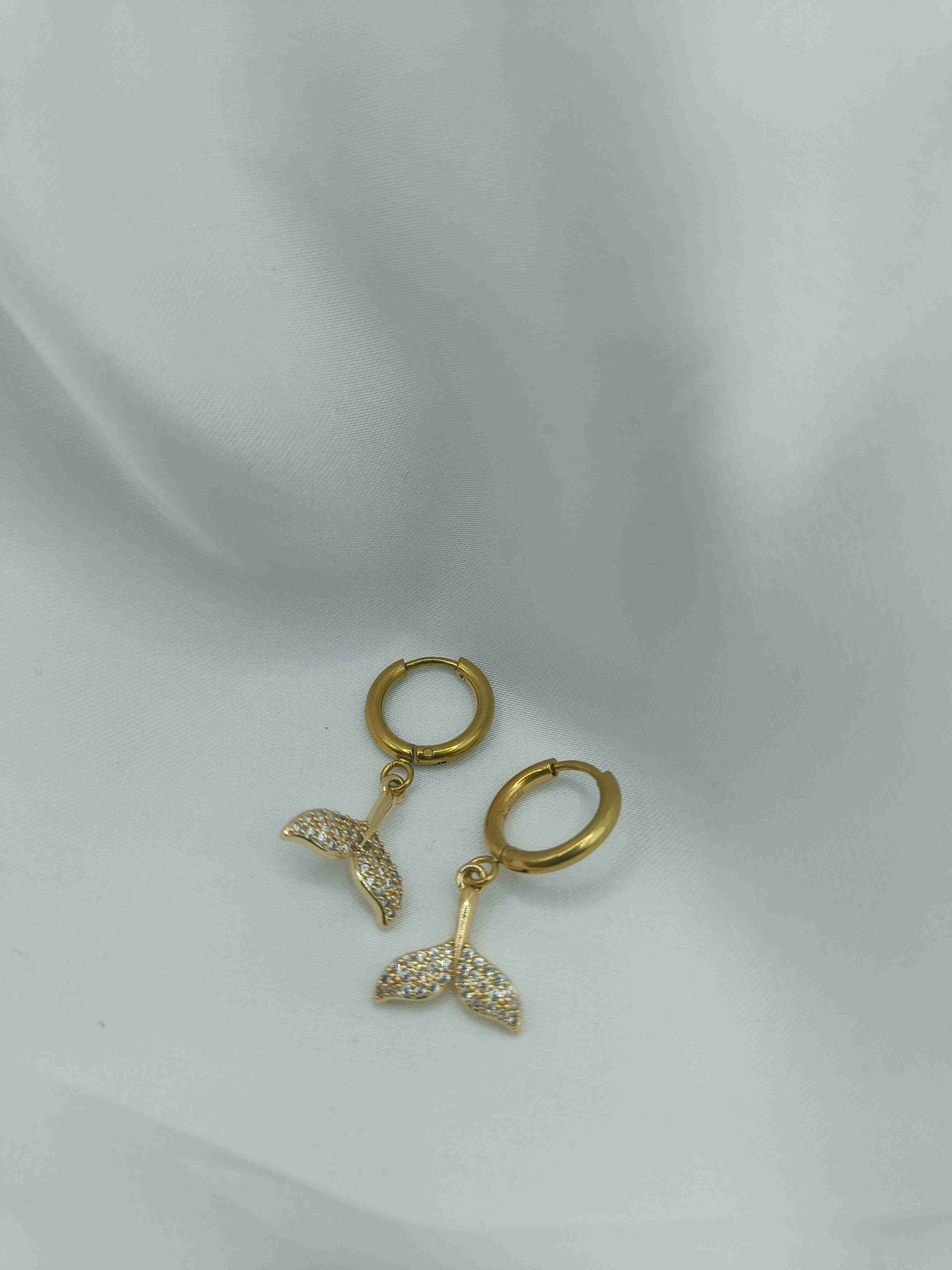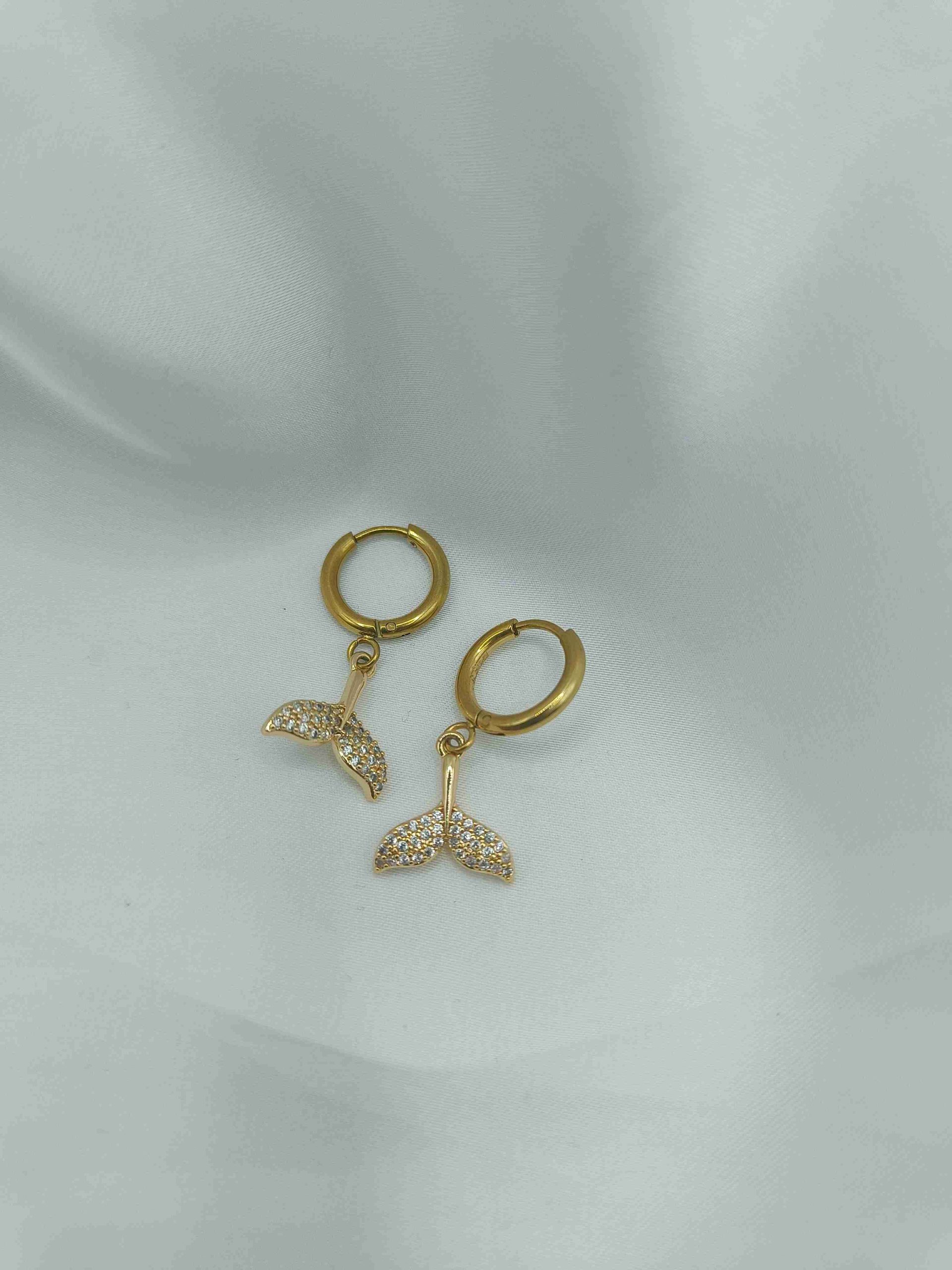 Σκουλαρίκια από ανοξείδωτο ατσάλι σε χρυσό χρώμα με μικρό, διακριτικό κρικάκι και κρεμαστό στοιχείο μια λαμπερή ουρά γοργόνας, διακοσμημένη με λευκά ζιργκόν. Ένα κόσμημα που αποπνέει αύρα καλοκαιριού, θάλασσας και φαντασίας, προσθέτοντας μία κομψή, παιχνιδιάρικη πινελιά σε κάθε εμφάνιση.