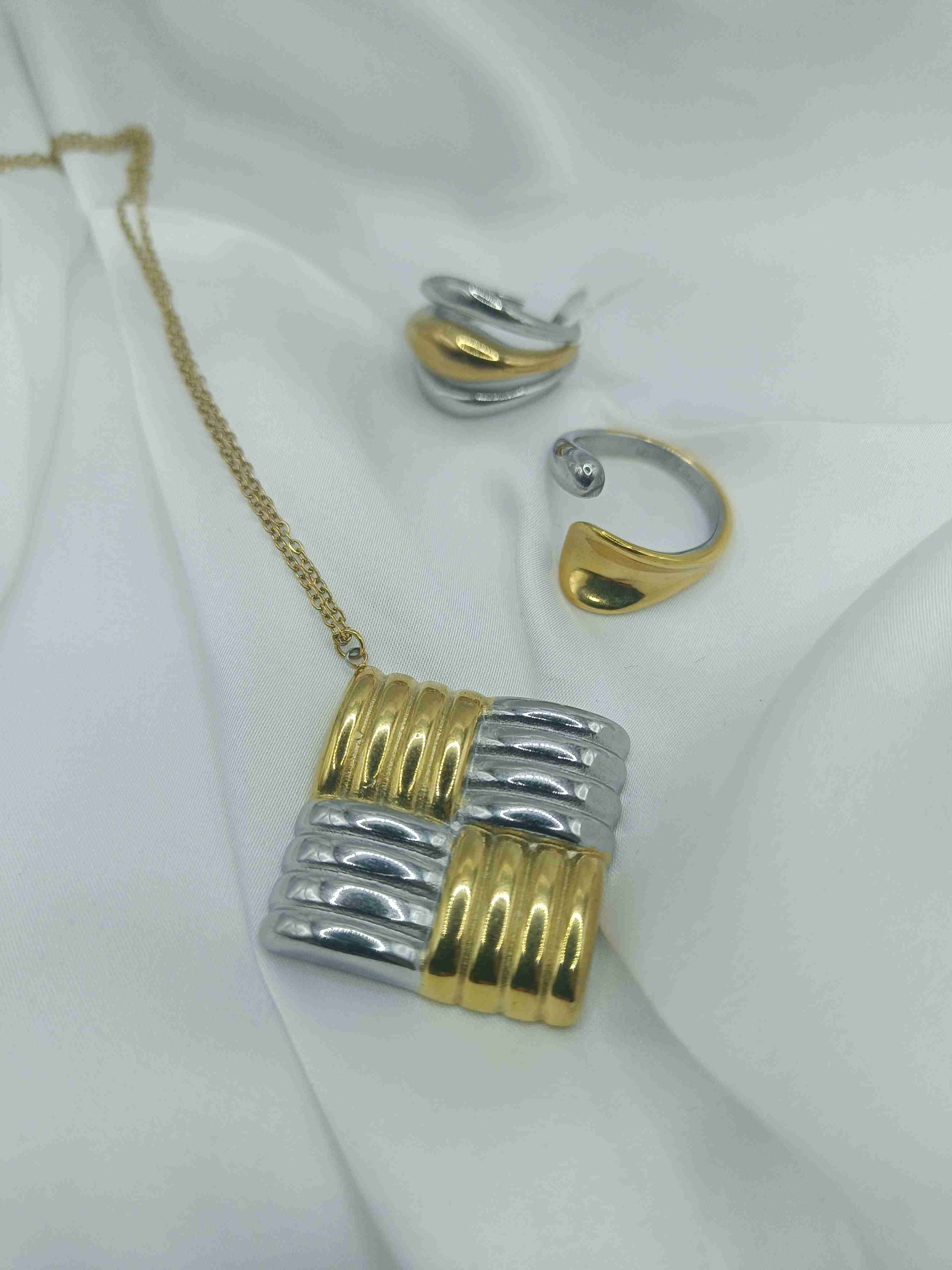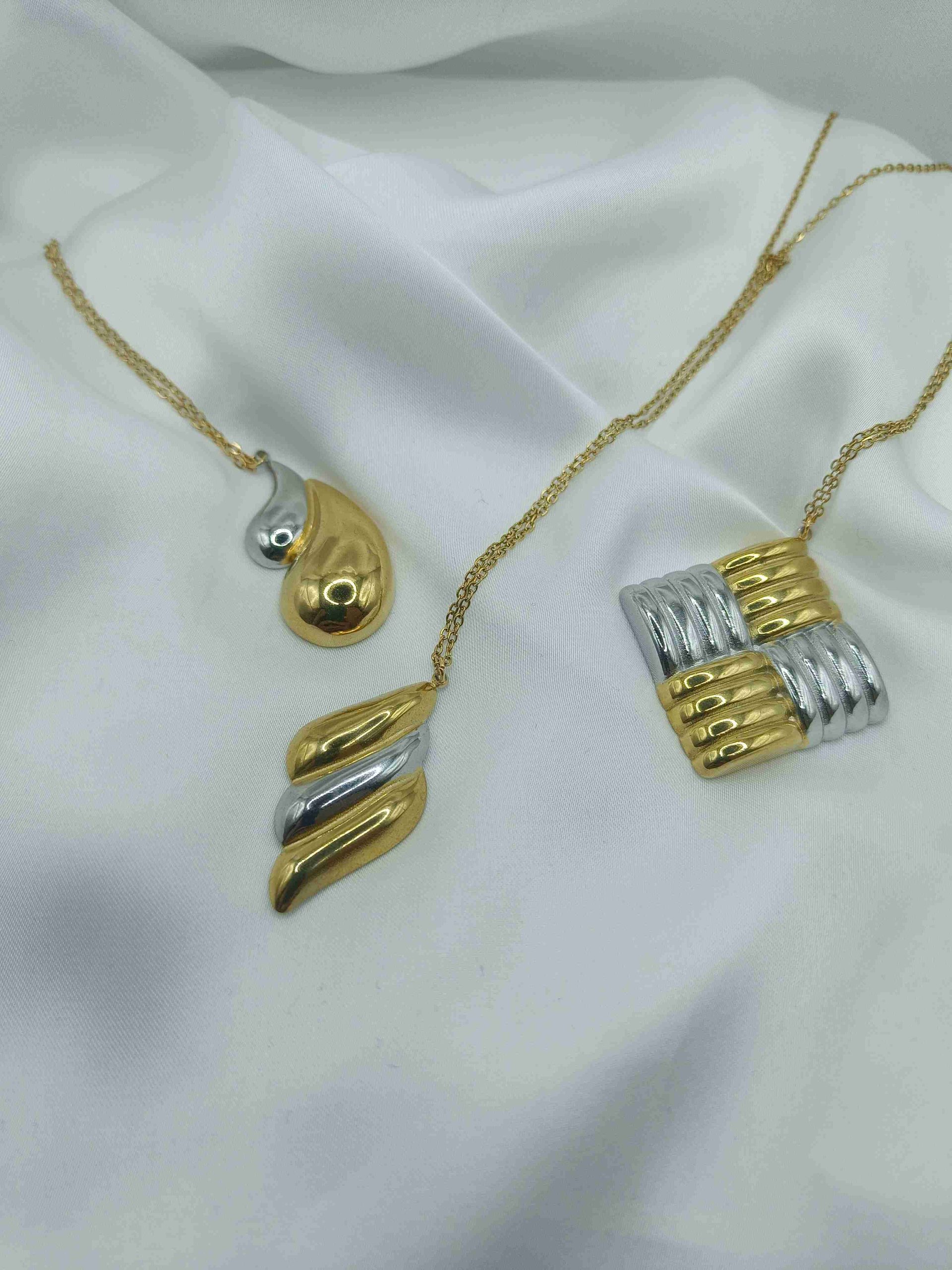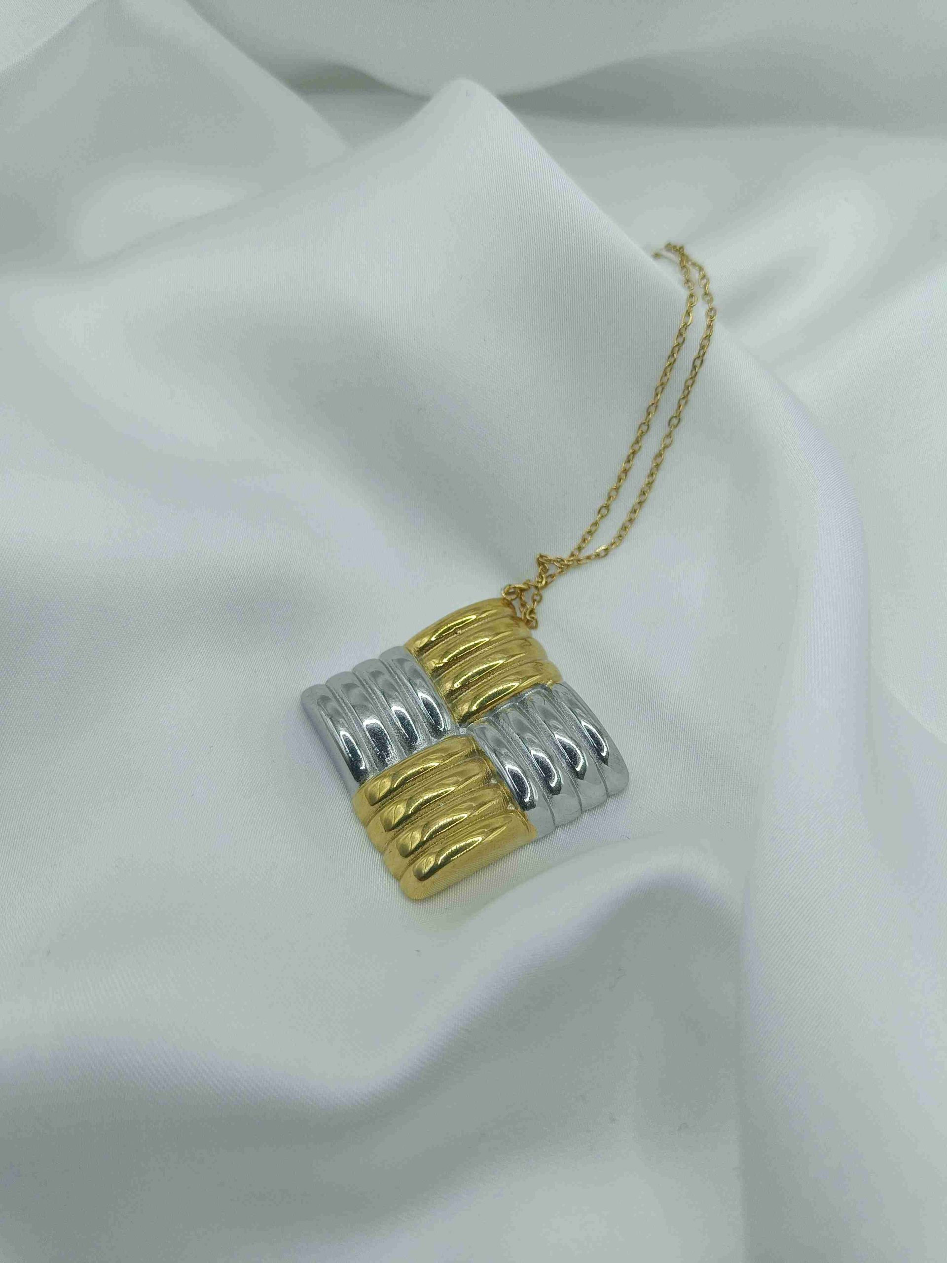Ένα statement κολιέ που αποπνέει ρετρό κομψότητα και μοντέρνα δυναμική. Το Revya διαθέτει χρυσή αλυσίδα από ανοξείδωτο ατσάλι και ένα μεγάλο, ανάγλυφο μοτίφ σε σχήμα ρόμβου, με γραμμικές λεπτομέρειες σε χρυσό και ασήμι.
