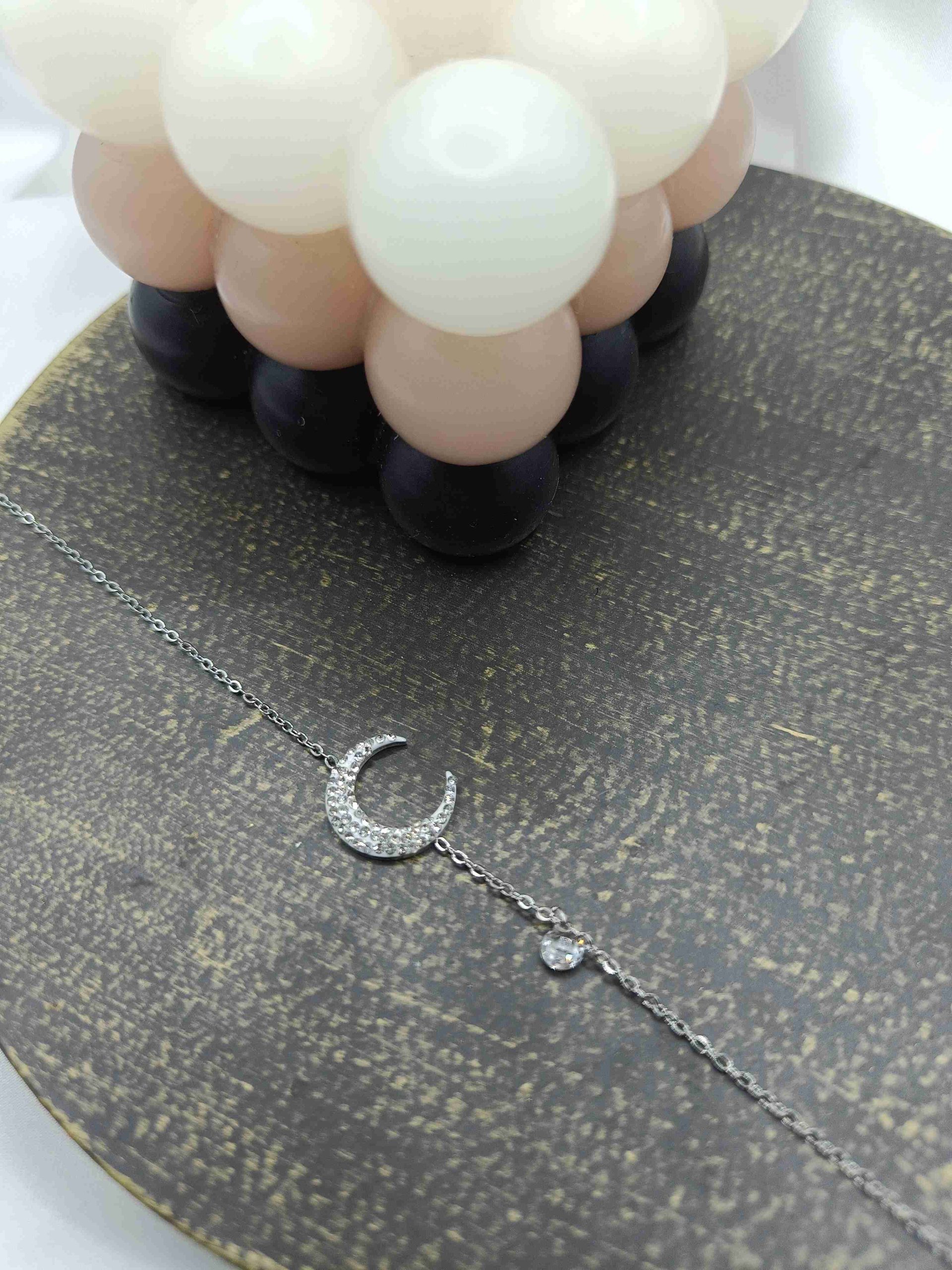 Ένα κομψό και αέρινο βραχιόλι από ανοξείδωτο ατσάλι, διακοσμημένο με ένα λαμπερό μισοφέγγαρο με στρας, που συμβολίζει τη μαγεία της νύχτας και τη διαρκή αλλαγή. Ένα διακριτικό κρύσταλλο στην αλυσίδα προσθέτει μια επιπλέον πινελιά λάμψης, δημιουργώντας ένα κομψό και διαχρονικό κόσμημα.