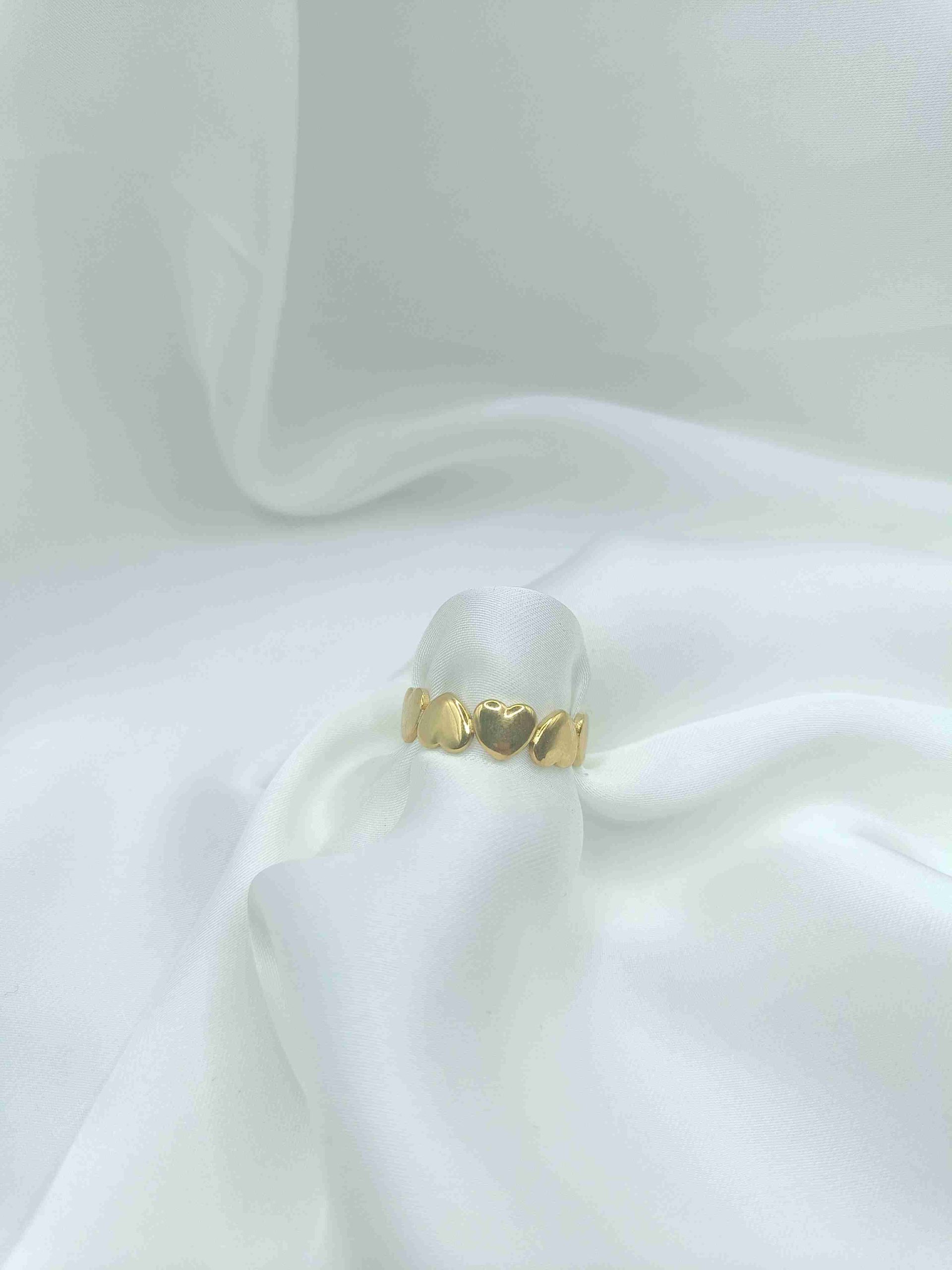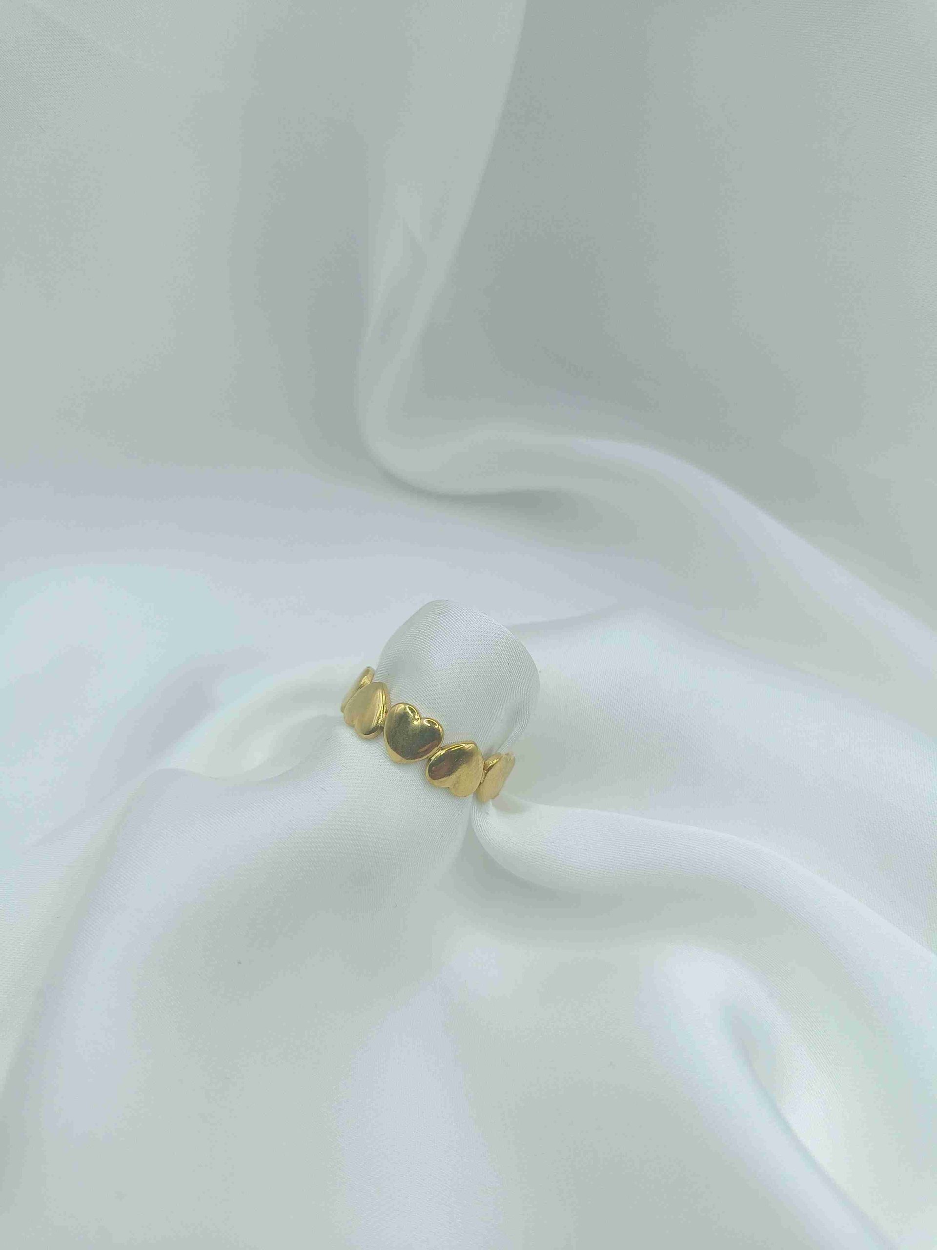 Το Selina είναι ένα γλυκό και παιχνιδιάρικο δαχτυλίδι από ανοξείδωτο ατσάλι σε χρυσή απόχρωση, διακοσμημένο με μια σειρά από μικρές καρδούλες που αγκαλιάζουν το δάχτυλο. Ο σχεδιασμός του αποπνέει ρομαντισμό και λεπτότητα, καθιστώντας το ιδανικό για όσους θέλουν να προσθέσουν μια δόση τρυφερότητας στην καθημερινή τους εμφάνιση. Ένα κόσμημα γεμάτο αγάπη και στυλ.