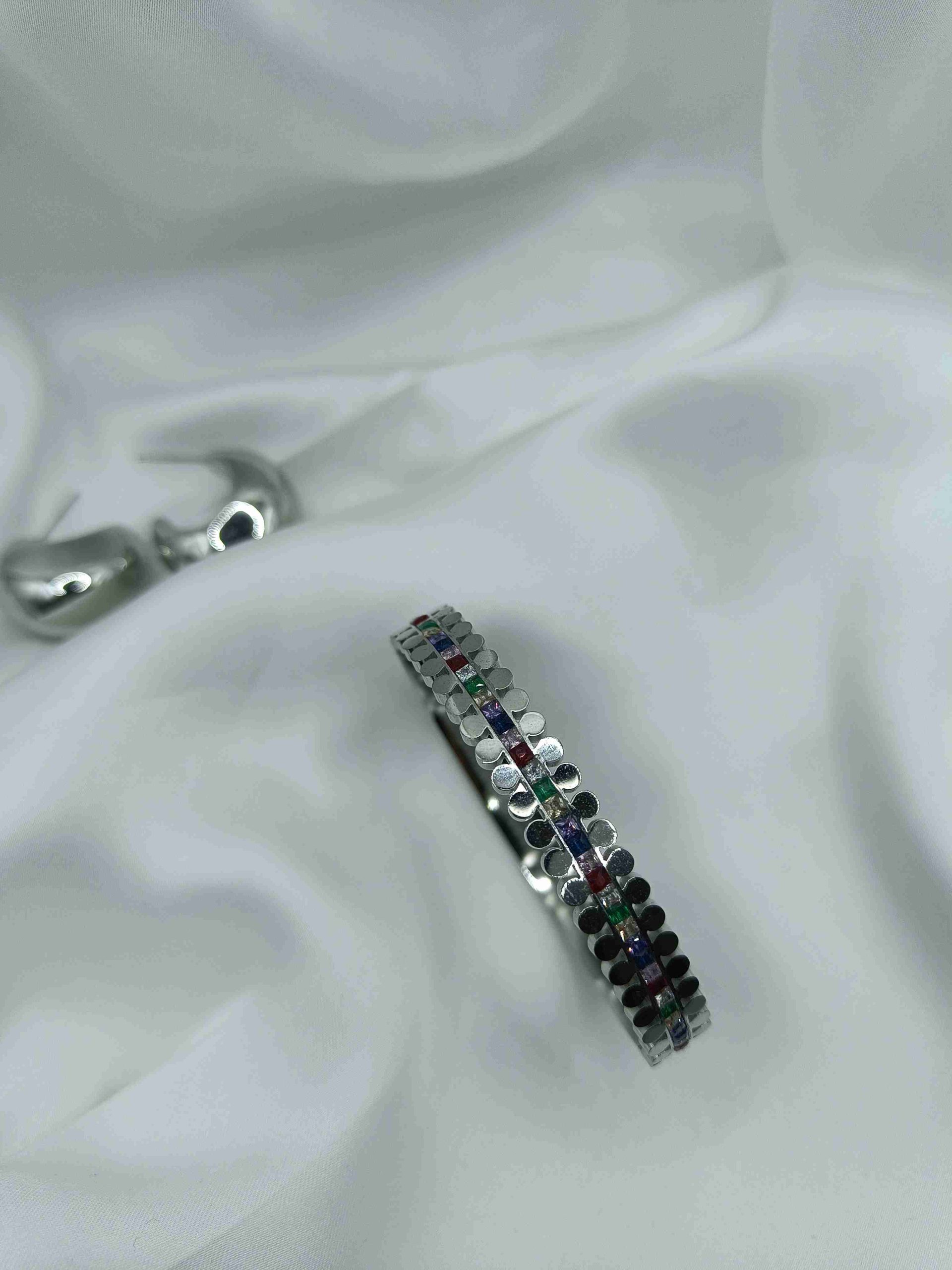 Μια εντυπωσιακή χειροπέδα με πολύχρωμα στρας σε αποχρώσεις λευκού, κόκκινου, ροζ, μπλε, μωβ, μπεζ και πράσινου, που προσθέτουν λάμψη και ζωντάνια σε κάθε εμφάνιση. Ο εκλεπτυσμένος σχεδιασμός της την καθιστά ιδανική για κάθε περίσταση, ενώ οι αποχρώσεις της ταιριάζουν εύκολα με κάθε στυλ και μπορούν να συνδυαστούν με άλλα κοσμήματα.