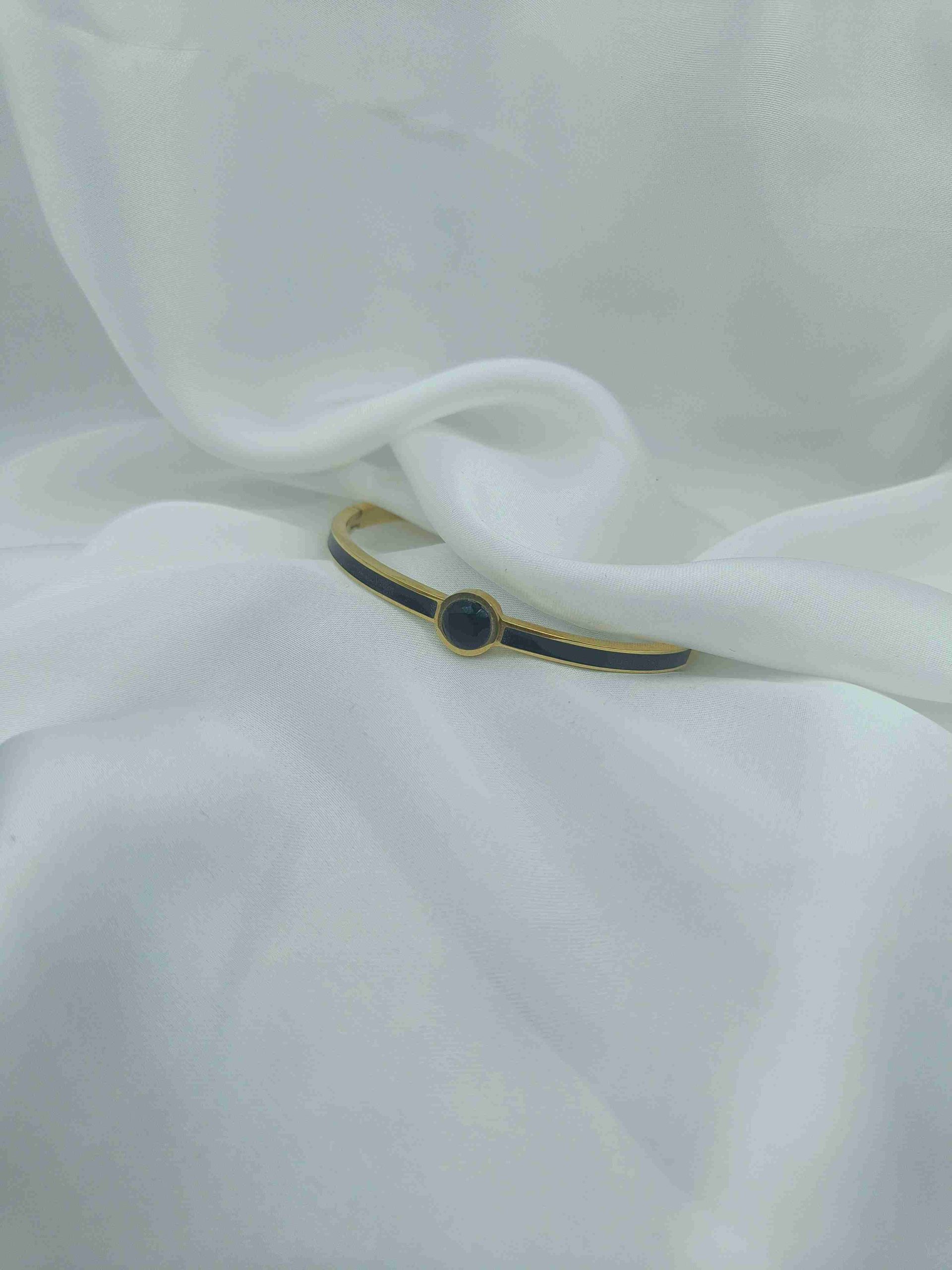 Με μαύρο στρας και κούμπωμα ασφαλείας. Ένα βραχιόλι τύπου χειροπέδα από ανοξείδωτο ατσάλι σε κομψό χρυσό χρώμα, με έντονες μαύρες λεπτομέρειες και ένα εντυπωσιακό μαύρο στρας στο κέντρο. Η αντίθεση του χρυσού με το βαθύ μαύρο δημιουργεί μια δυναμική και σοφιστικέ αισθητική, ιδανική για εκείνες που αγαπούν τις bold λεπτομέρειες και τη διαχρονική φινέτσα.