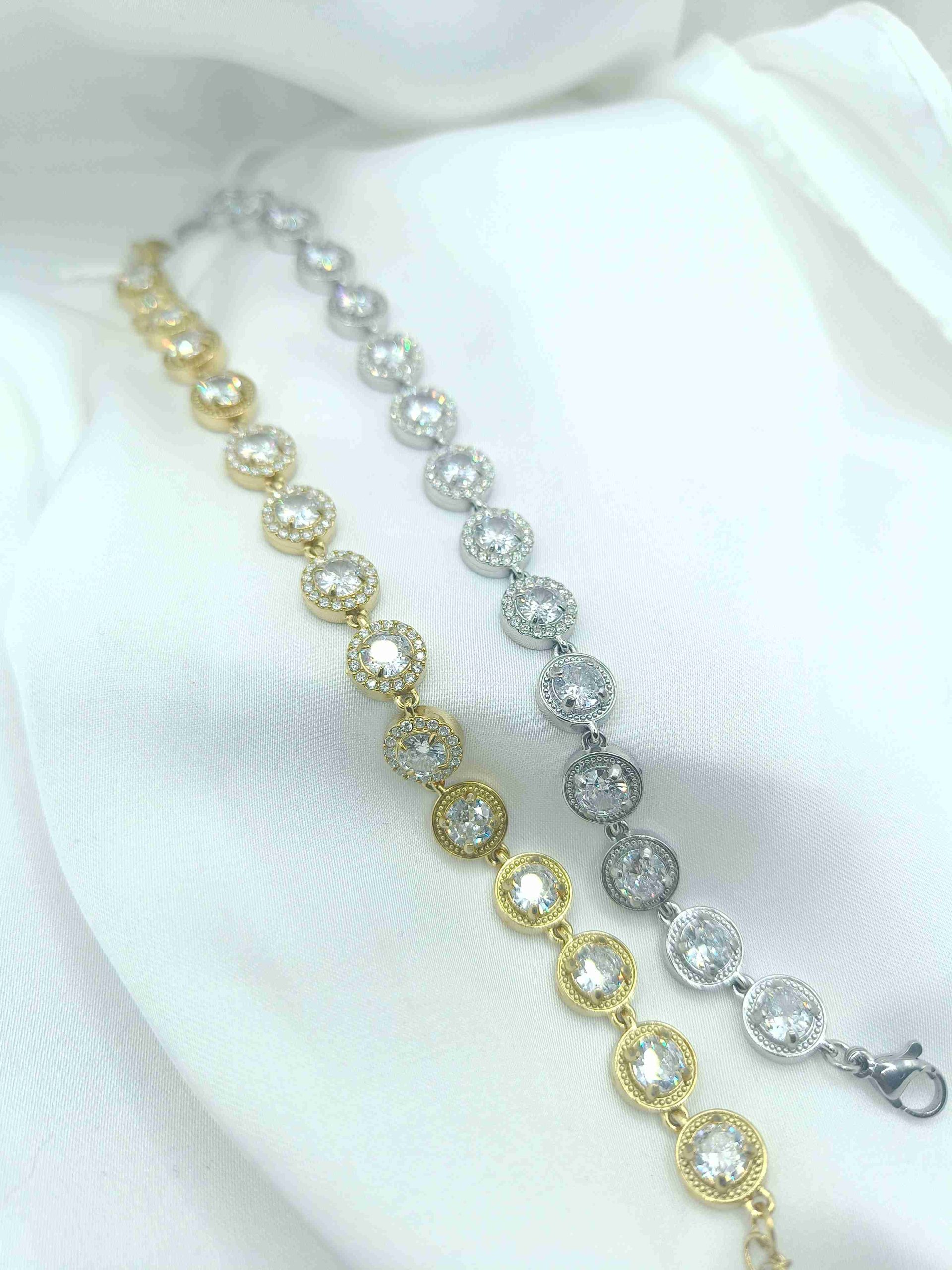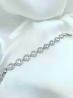 Μία elegant προσθήκη στη σειρά sparkle. Στο βραχιόλι αυτό τα κεντρικά 5 κυκάλια έχουν διάφανο, λαμπερό ζιργκόν στη μέση και γύρω γύρω μικρά διάφανα ζιργκόν και τα 5 κυκλάκια δεξιά και αριστερά έχουν μόνο το κεντρικό, ίδιο, διάφανο ζιργκόν.