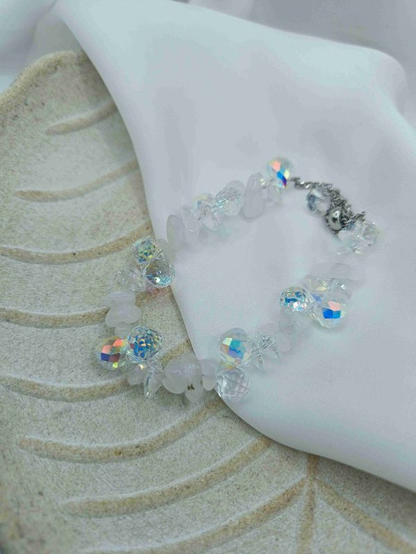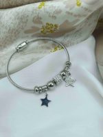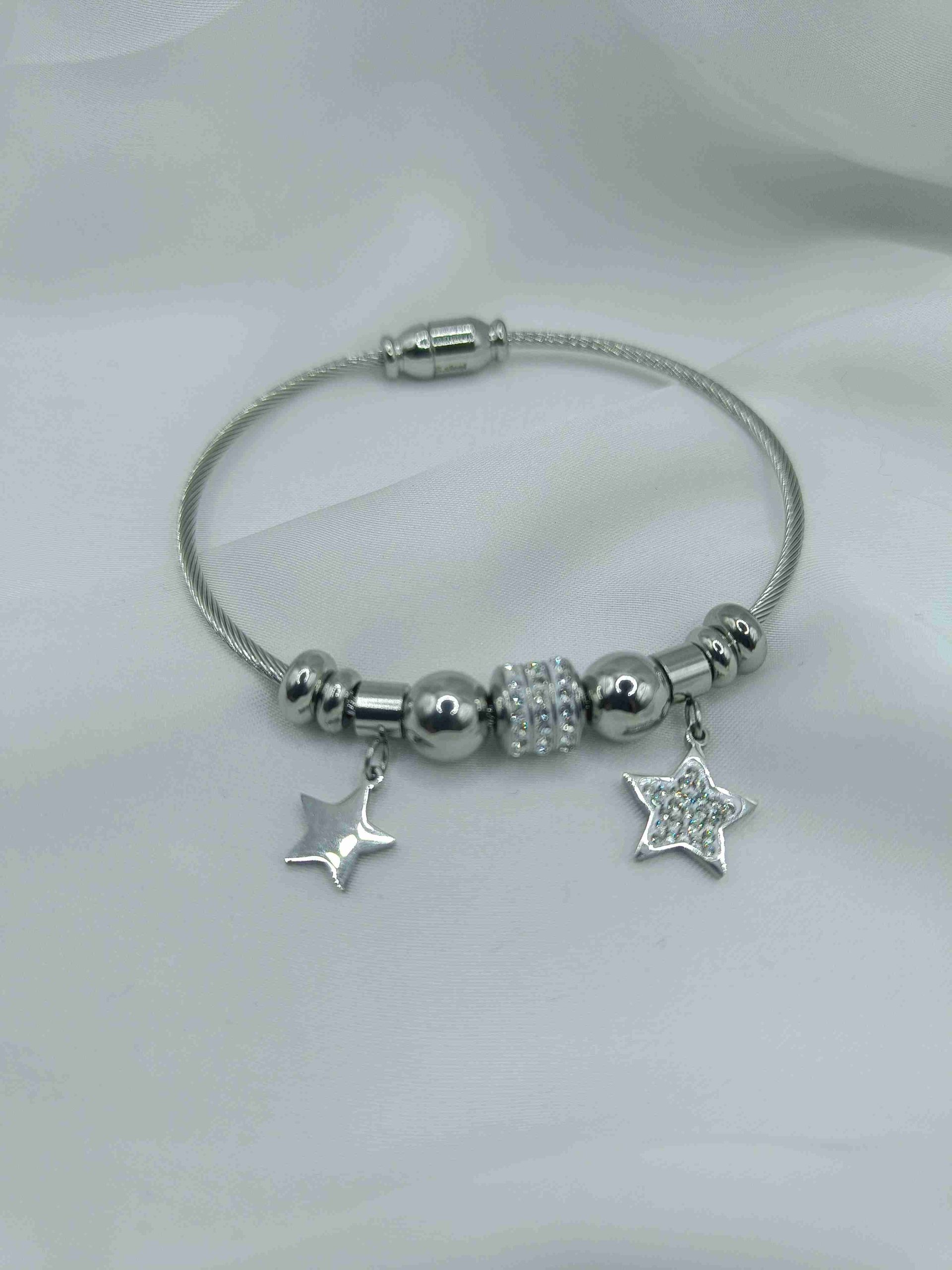 Με μαγνωτικό κούμπωμα το Stellaire είναι ένα σταθερό βραχιόλι τύπου χειροπέδα από ανοξείδωτο ατσάλι, με δύο κρεμαστά αστέρια που κινούνται ελεύθερα: το ένα λαμπερό με στρας, η άλλη minimal και διακριτική. Στο κέντρο δεσπόζει μια μεγάλη μεταλλική χάντρα με στρας, πλαισιωμένη από κυλινδρικές και στρογγυλές χάντρες σε γήινη μεταλλική λάμψη.