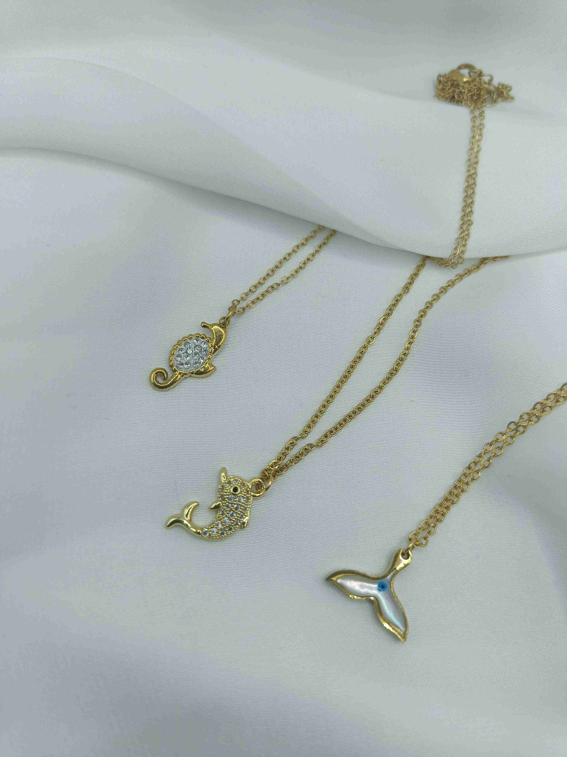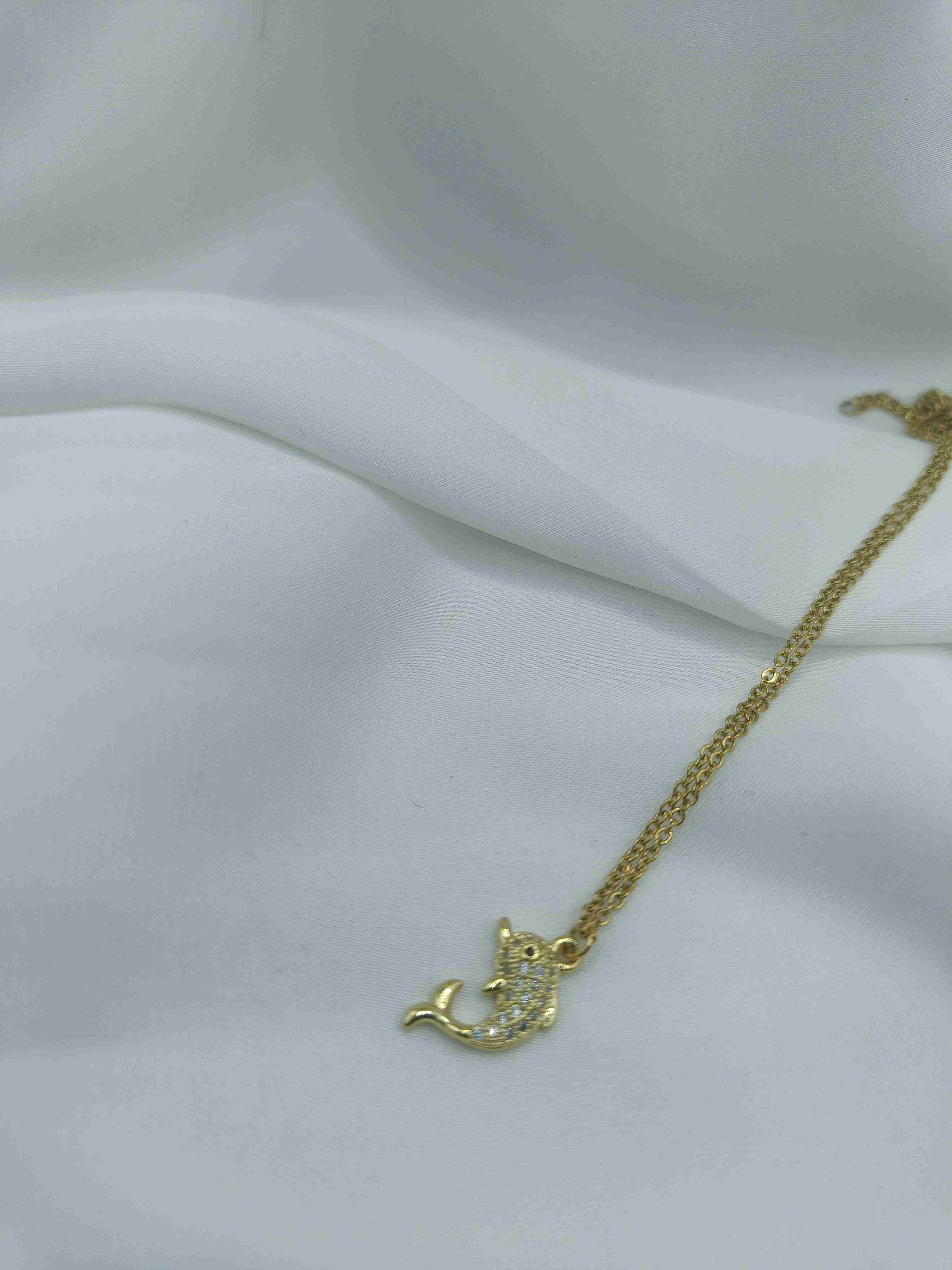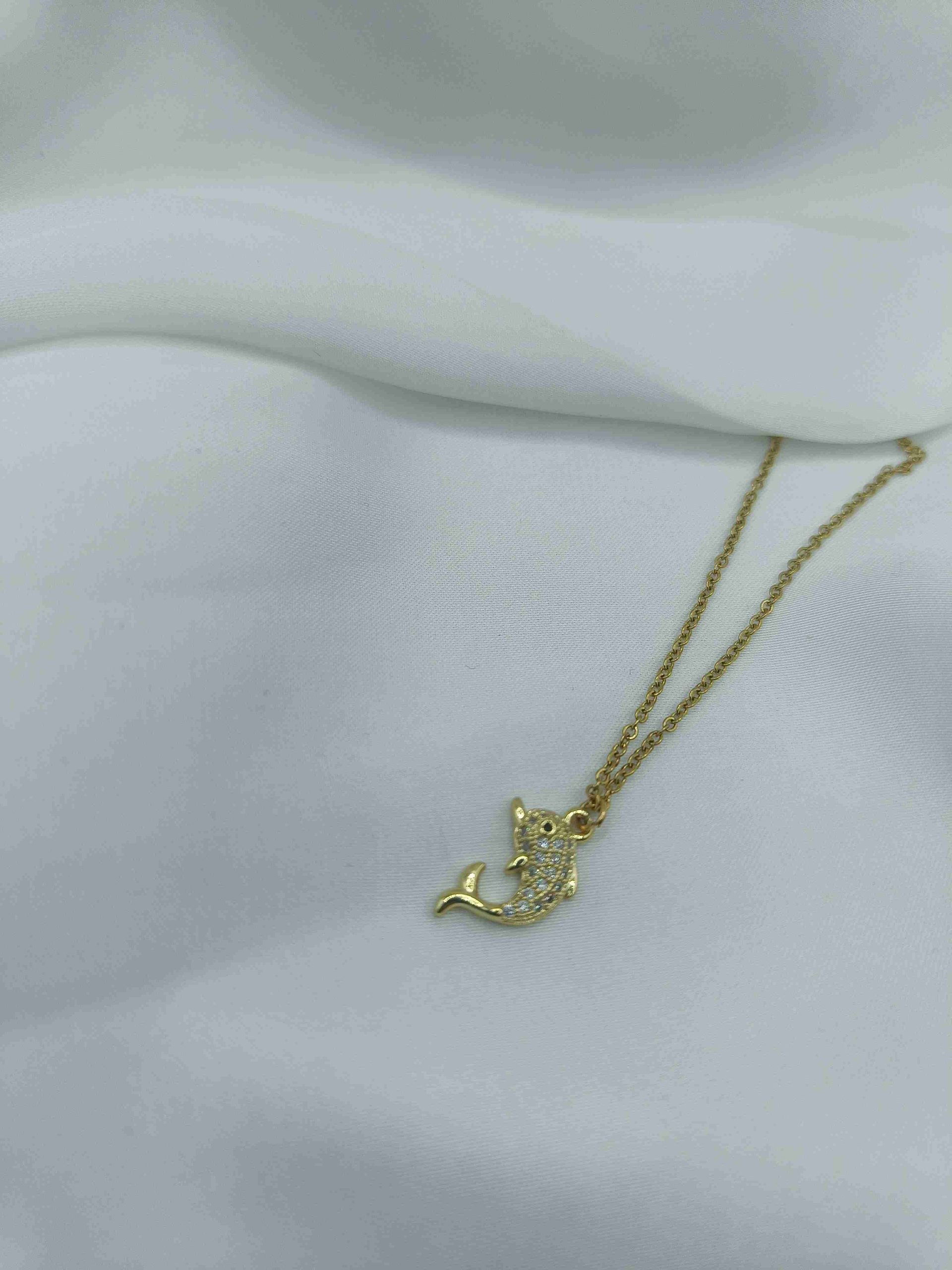 Ένα λαμπερό κολιέ από ανοξείδωτο ατσάλι σε χρυσό χρώμα, με ένα κεντρικό στοιχείο δελφινάκι διακοσμημένο με λευκά αστραφτερά ζιργκόν. Το δελφίνι, σύμβολο χαράς, προστασίας και ελευθερίας, δίνει στο κόσμημα μια παιχνιδιάρικη αλλά και κομψή θαλασσινή αύρα.