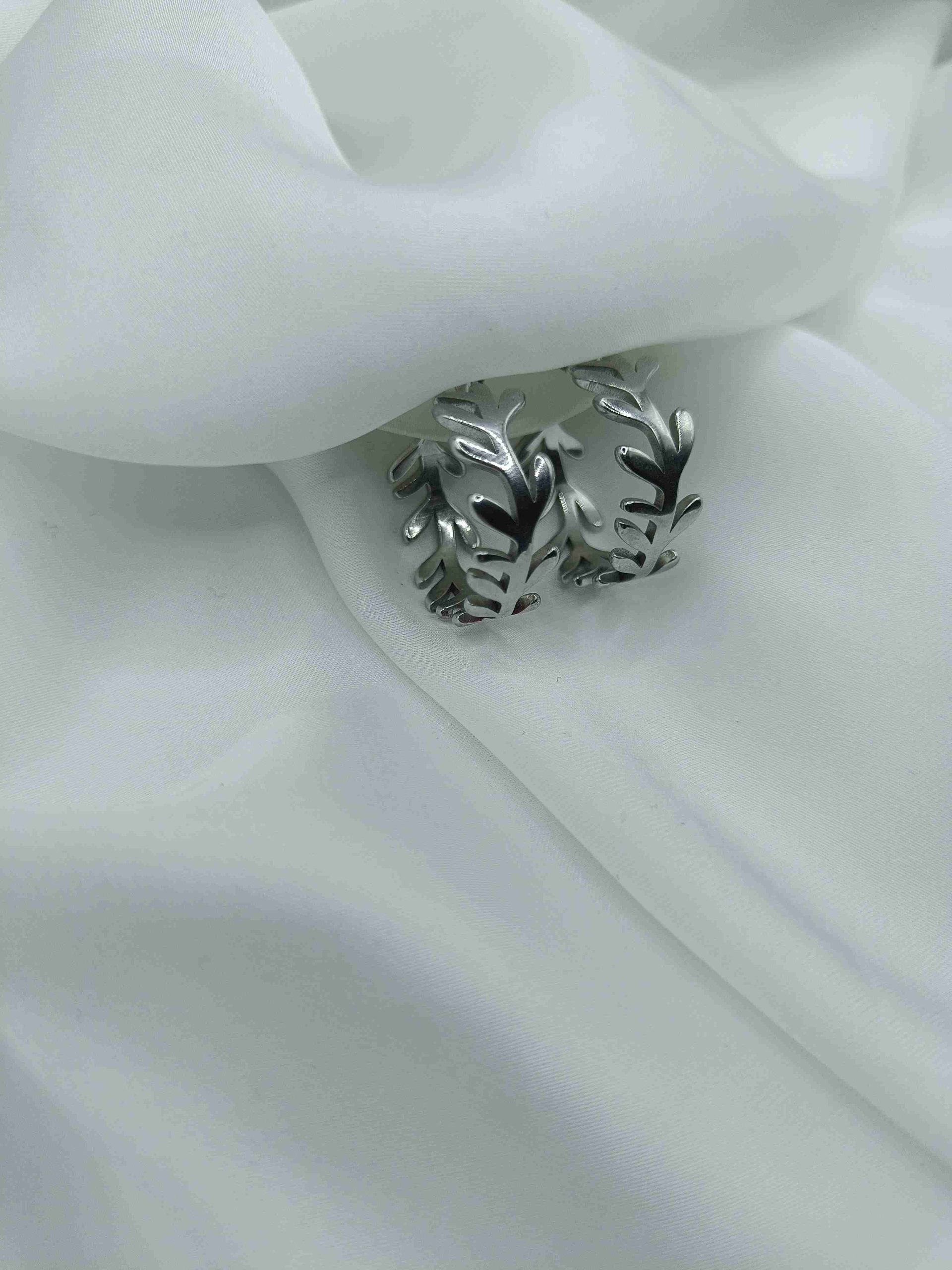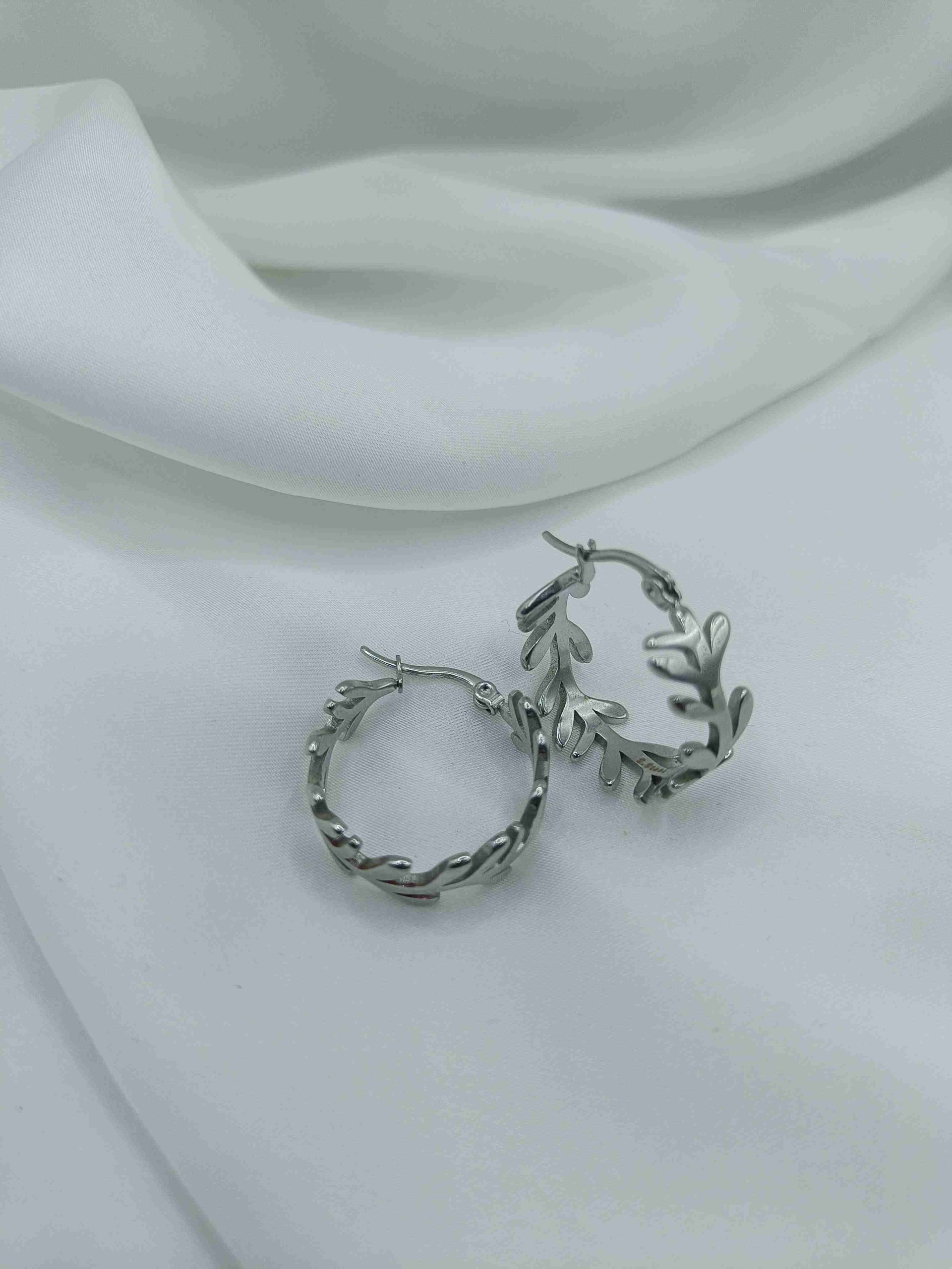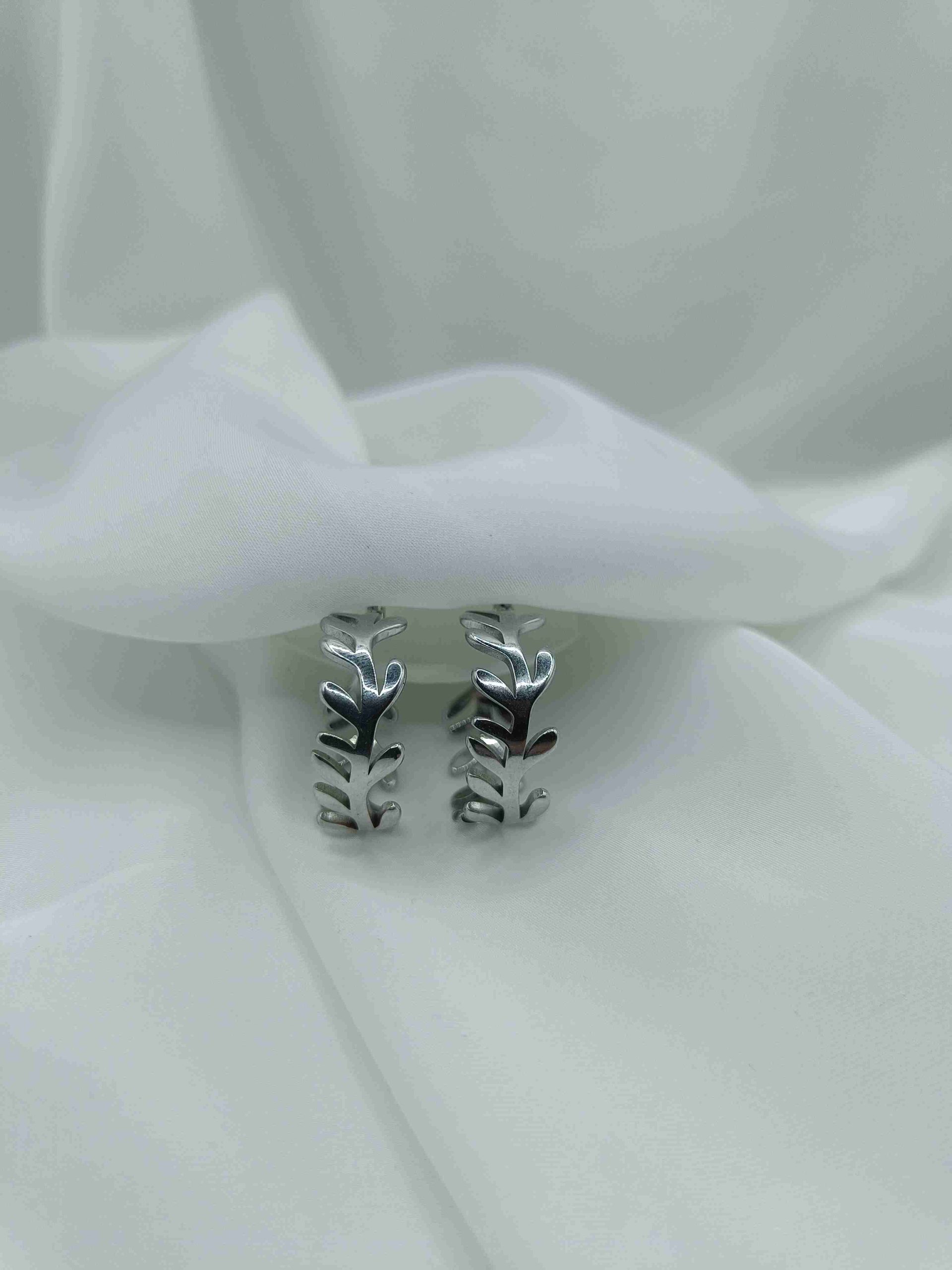 Φυσική κομψότητα με διαχρονική δύναμη. Τα Thyra είναι σκουλαρίκια κρίκοι σε σχήμα φύλλων, από ανοξείδωτο ατσάλι, που αποπνέουν μία ήρεμη αλλά επιβλητική χάρη. Το ανάγλυφο σχέδιο τους δίνει την αίσθηση ζωντάνιας, σαν να αιχμαλωτίζουν τη ροή του ανέμου πάνω στη φύση.