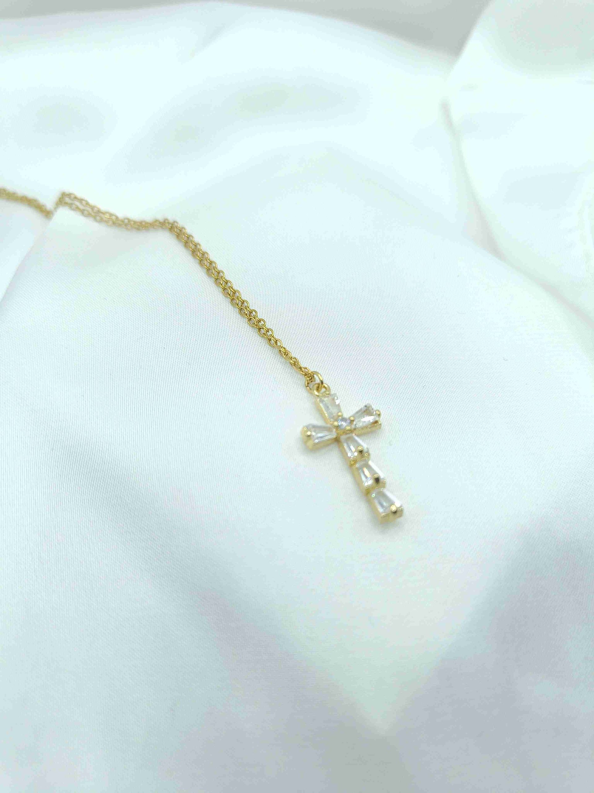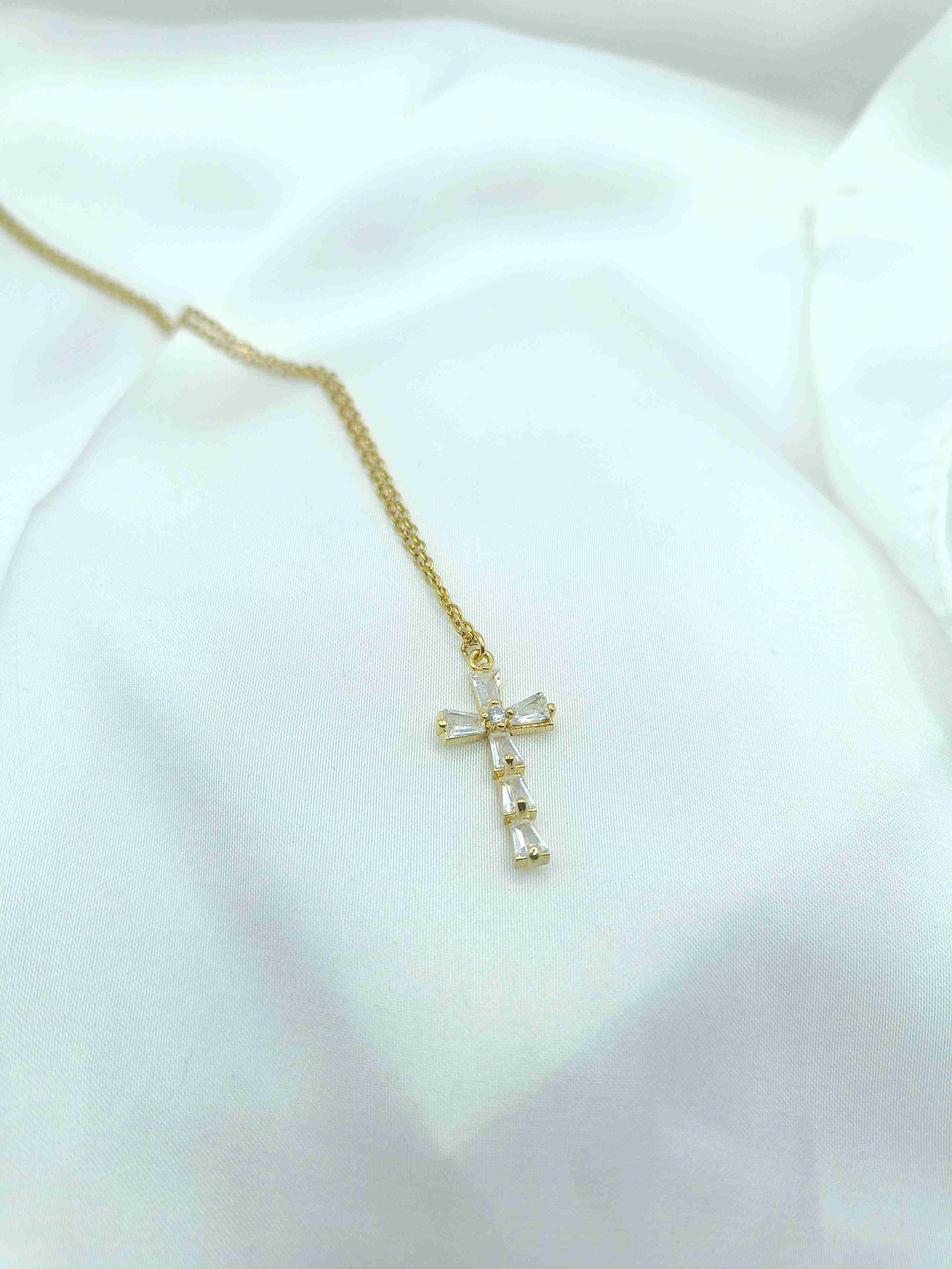 Ο σταυρός Valine ξεχωρίζει για τη λεπτή, μακρόστενη σχεδίασή του και τη διακριτική του λάμψη. Κατασκευασμένος από ανοξείδωτο ατσάλι σε χρυσό χρώμα, στολίζεται με μικρά λευκά ζιργκόν που αιχμαλωτίζουν το φως σε κάθε κίνηση.