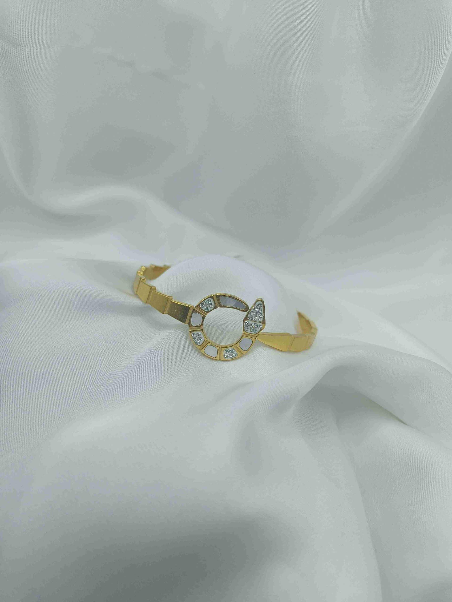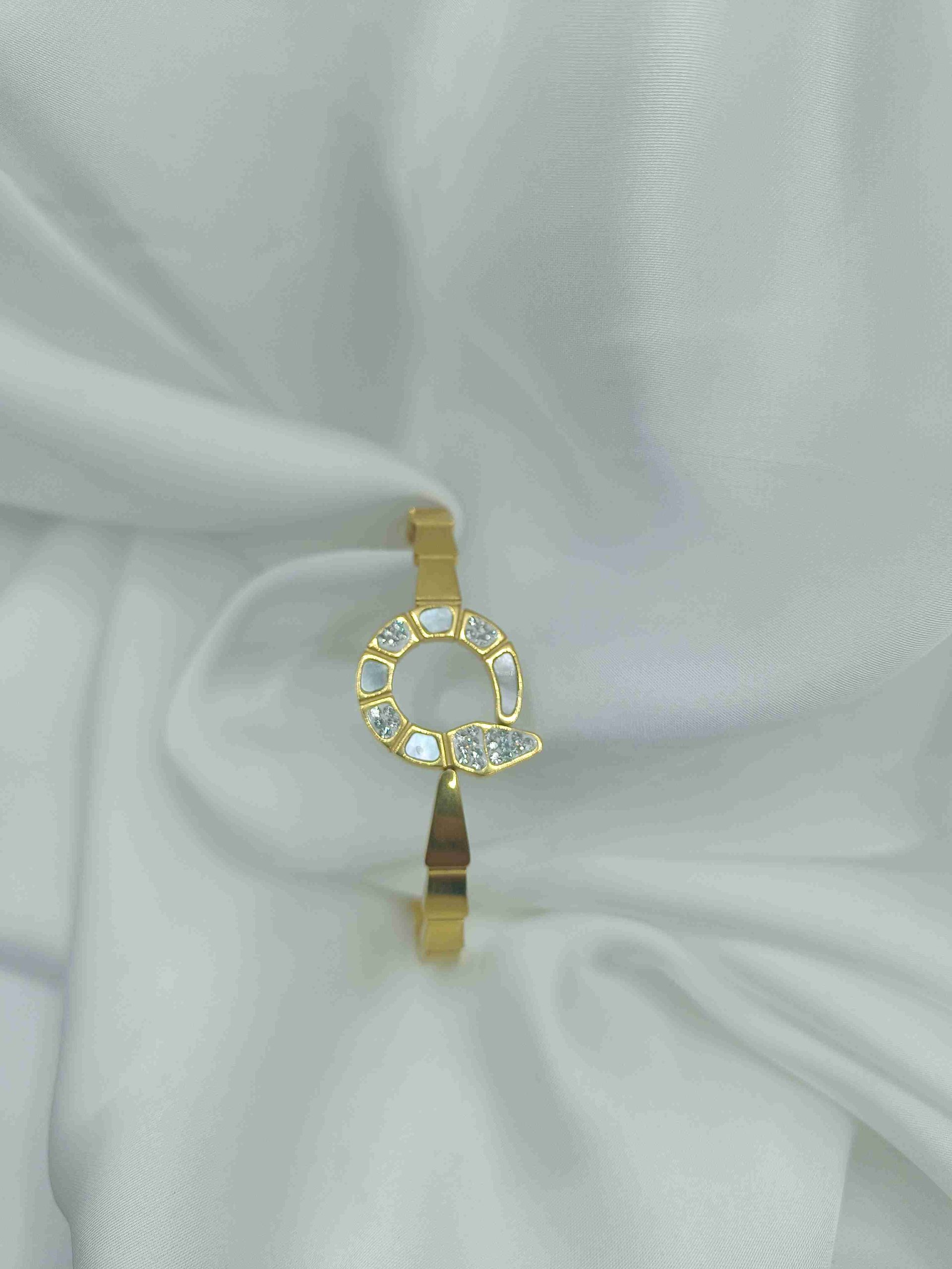 Με στρας, φίλντισι και κούμπωμα με ελατήριο. Ένα statement βραχιόλι από ανοξείδωτο ατσάλι σε χρυσό χρώμα, με εντυπωσιακό κυκλικό στοιχείο πυ θυμίζει φίδι και είναι διακοσμημένο με λευκά ζιργκόν και φίλντισι που θυμίζουν ηλιακή ακτινοβολία. Ο μοντέρνος, γεωμετρικός του σχεδιασμός συναντά την πρακτικότητα, χάρη στο κούμπωμα με ελατήριο, που το καθιστά ιδιαίτερα εύκολο και άνετο στη χρήση.