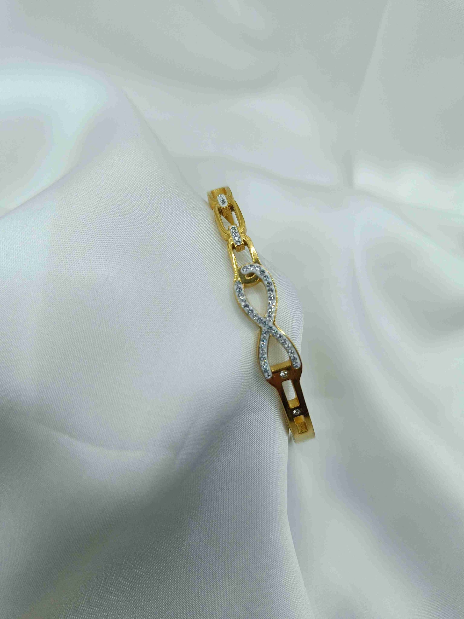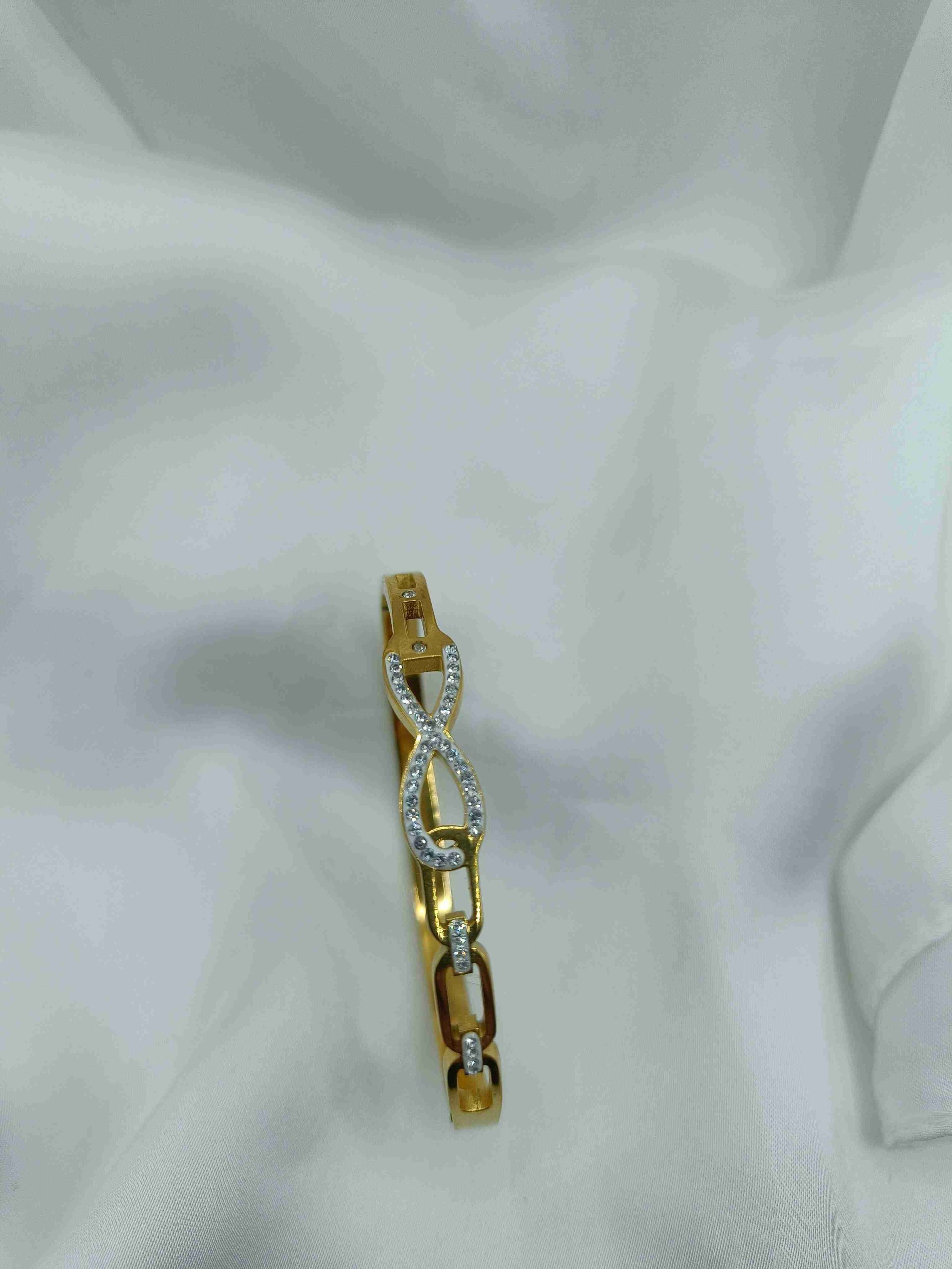 Ένα διαχρονικό βραχιόλι τύπου χειροπέδα, κατασκευασμένο από ανοξείδωτο ατσάλι, που συνδυάζει κομψότητα και νόημα. Το σύμβολο του απείρου στο επάνω μέρος, διακοσμημένο με λαμπερά στρας, εκφράζει την αιώνια ισορροπία και τη διαχρονική κομψότητα.