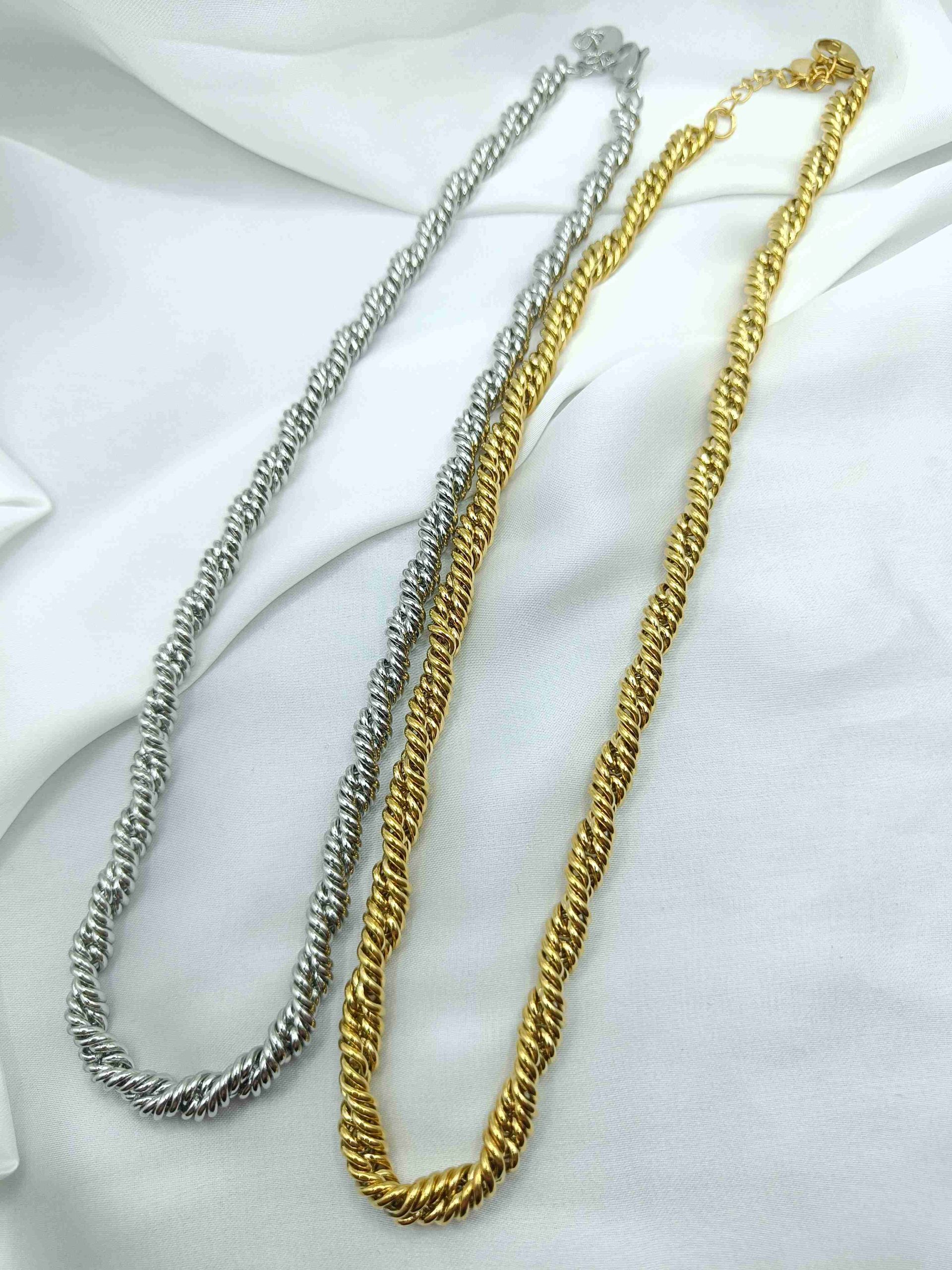 Το κολιέ Volina αναδεικνύει την ομορφιά της κίνησης και της ισορροπίας. Η εντυπωσιακή στριφτή αλυσίδα του αγκαλιάζει απαλά τον λαιμό, δημιουργώντας ένα statement look με καθαρή, μοντέρνα γραμμή.
