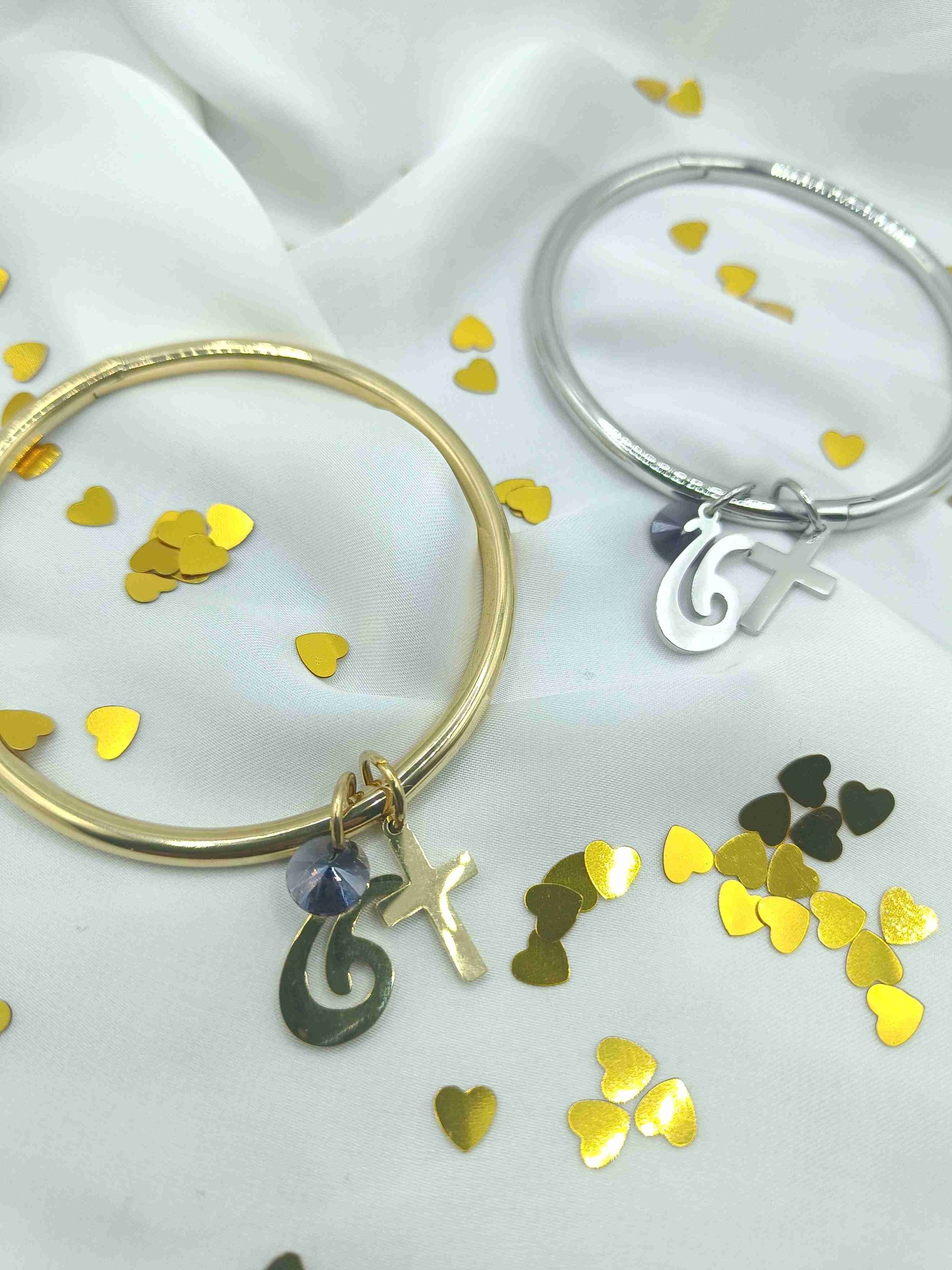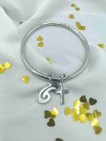 Βραχιόλι χειροπέδα από ανοξείδωτο ατσάλι, με καλλιτεχνικό 26, σταυρό και μωβ κρύσταλλο.