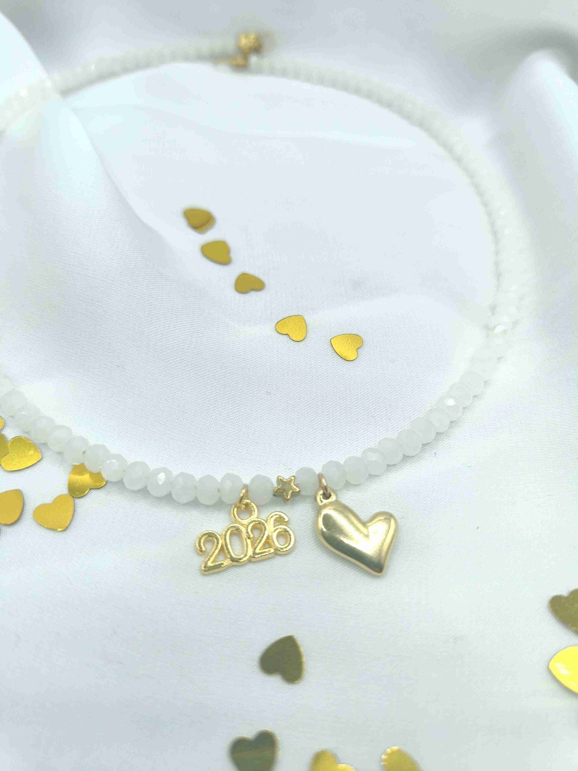 Το κολιέ Αγάπη δημιουργείται με προσοχή στη λεπτομέρεια: λευκές χάντρες, ατσάλινη καρδιά, επιχρυσωμένο αστεράκι αιματίτη και κρεμαστό “2026”.