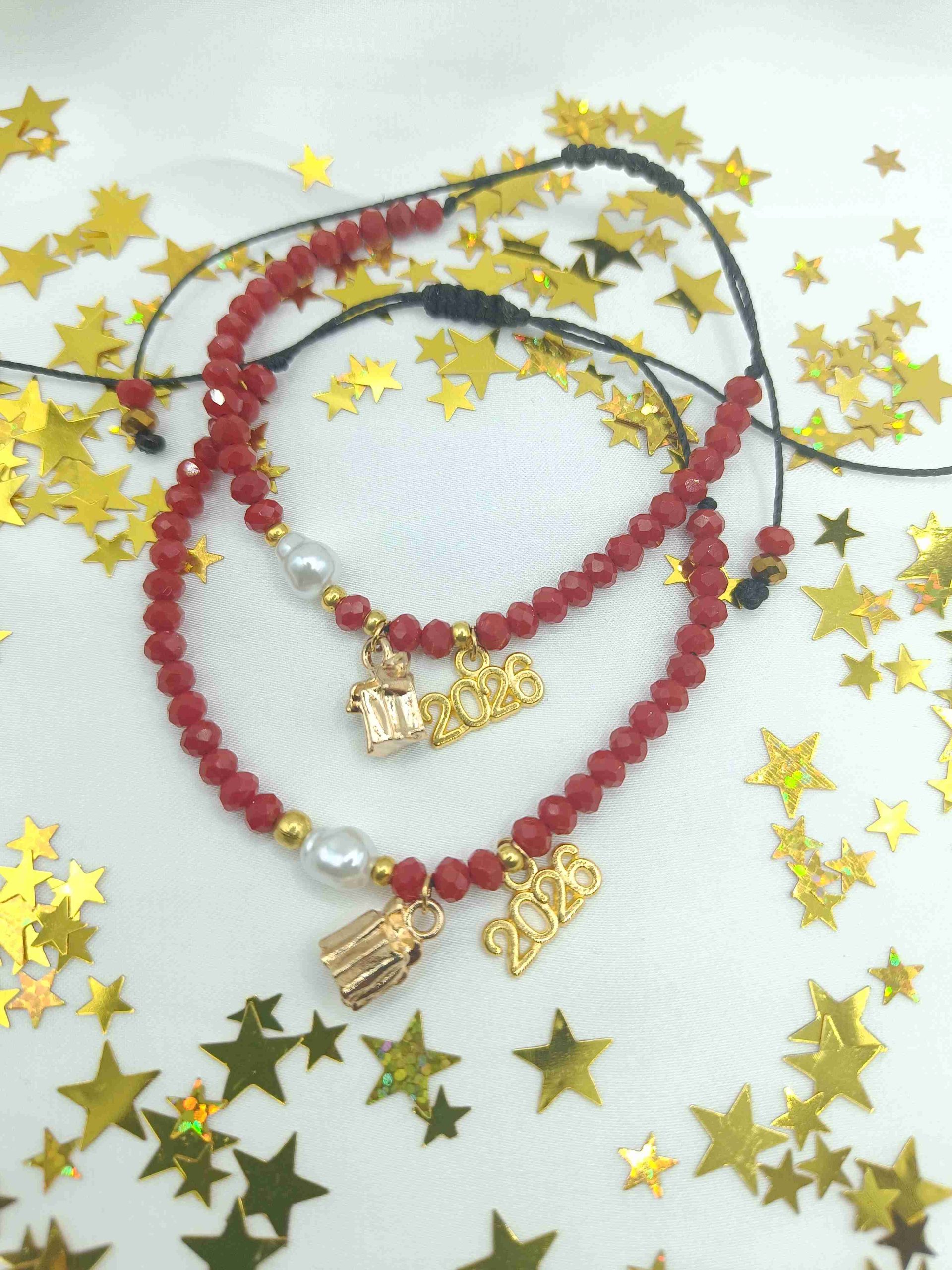 Χειροποίητο βραχιόλι με μαύρο κορδόνι, κόκκινες χάντρες, λευκή πέρλα + κρεμαστό δώρο + 2026