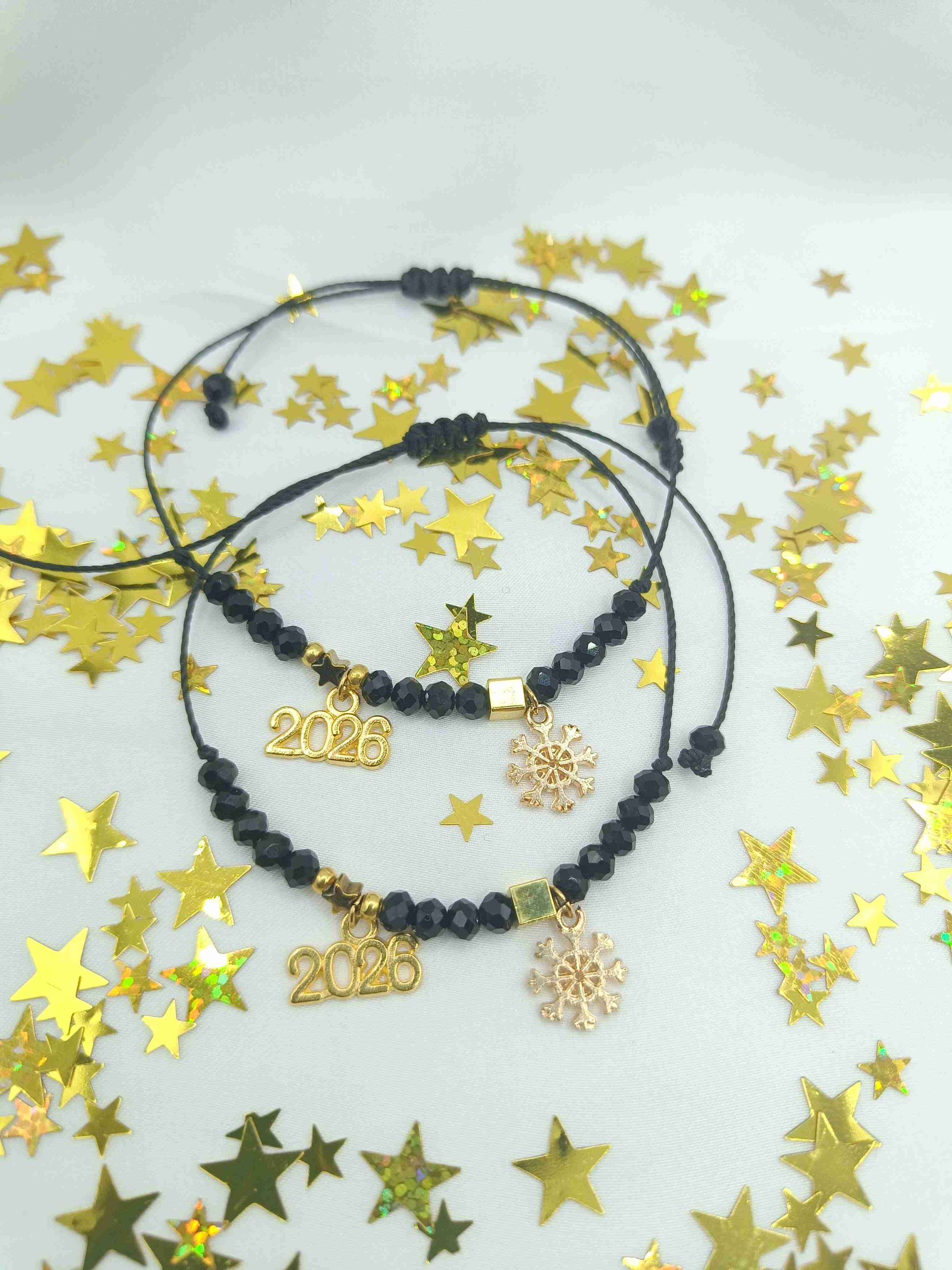Χειροποίητο βραχιόλι με μαύρο κορδόνι, μαύρες χάντρες, κυβό + αστεράκι επιχρυσωμένο αιματίτη, 2026 + χιονονιφάδα