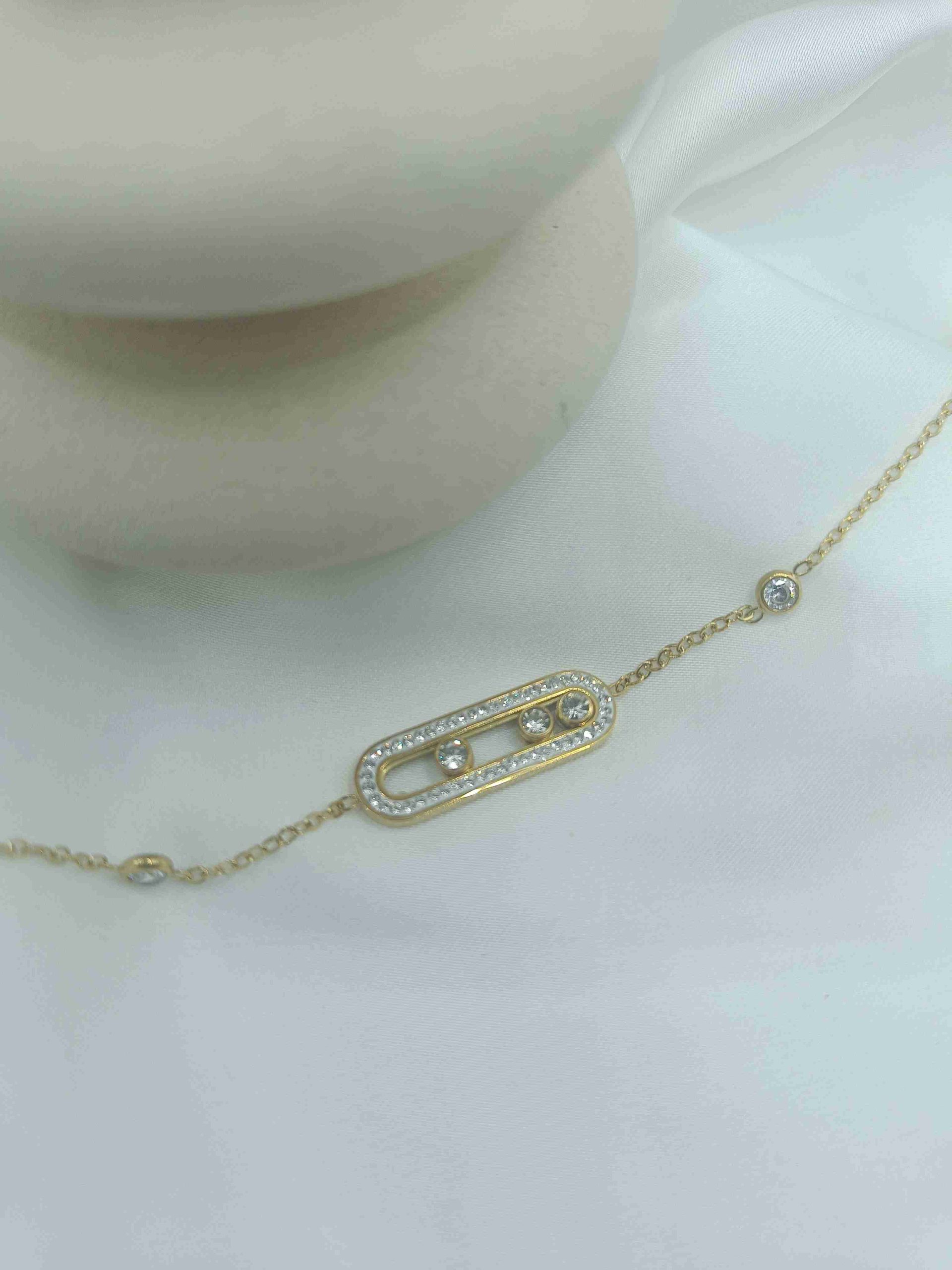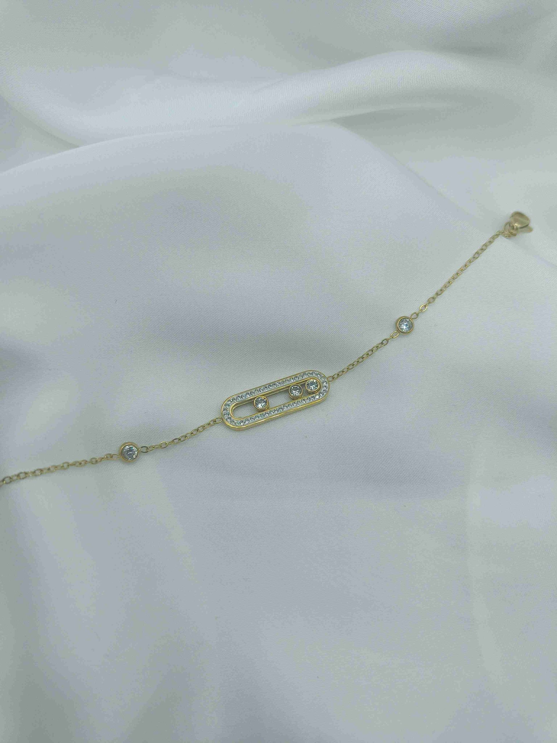 Το Zerra είναι ένα κομψό, μοντέρνο βραχιόλι από ανοξείδωτο ατσάλι σε χρυσό χρώμα, με γεωμετρικό σχεδιασμό και διακριτική λάμψη. Οι τρεις κεντρικές πέτρες ζιργκόν κινούνται ελεύθερα μέσα στο πλαίσιο, δημιουργώντας ένα παιχνίδι φωτός και κίνησης που τραβά το βλέμμα. Είναι ιδανικό για καθημερινή κομψότητα με μία δόση από κάτι “ζωντανό”.